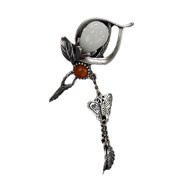 镀白金仿和田玉兰花南红镶嵌发簪蝴蝶复古做旧发饰玉兰发簪旗袍