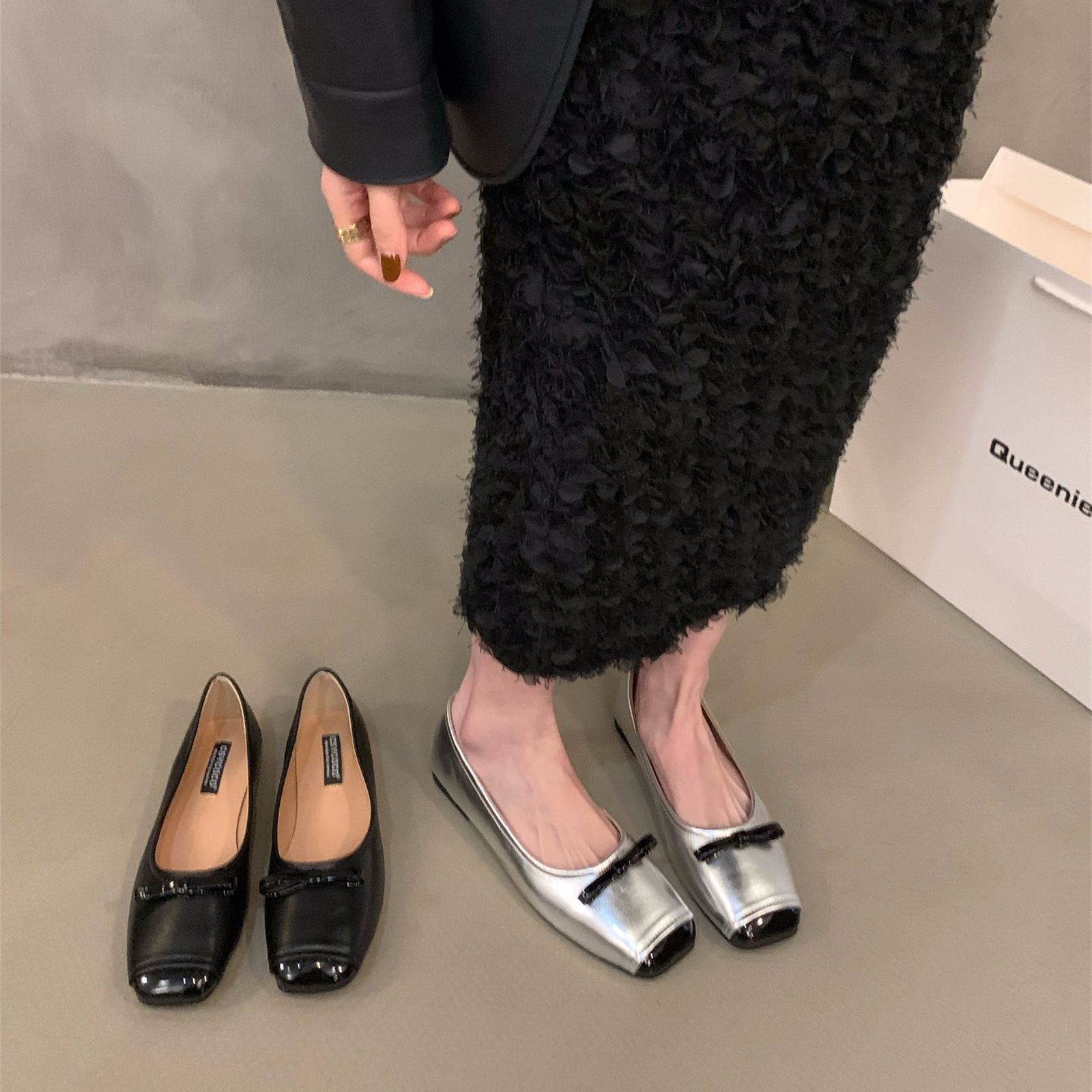 平底春秋法式银色方头单鞋女鞋子新款春季百搭气质温柔晚晚鞋