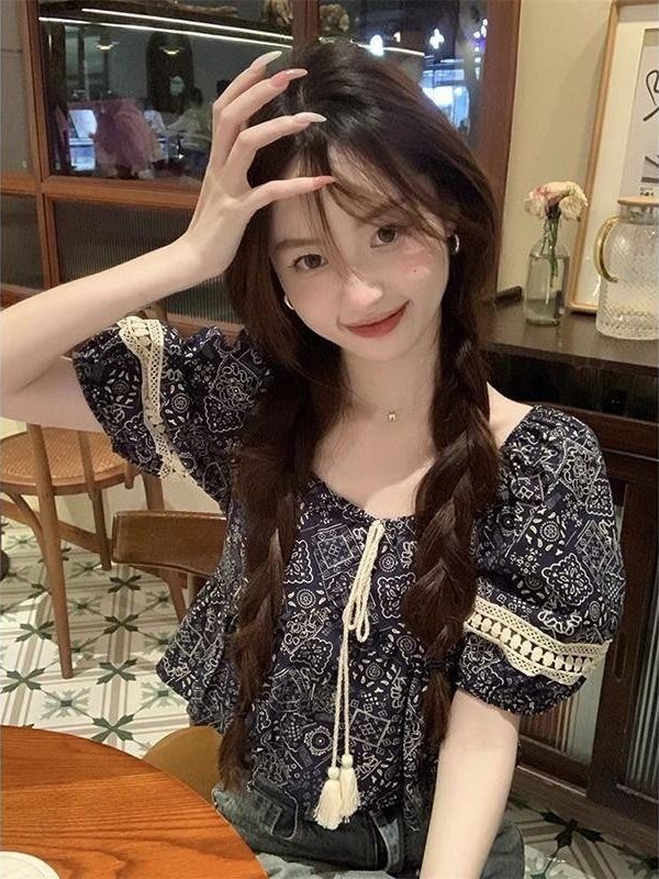 韩版方领泡泡袖衬衫女夏季新款流苏系带设计感镂空短袖上衣潮