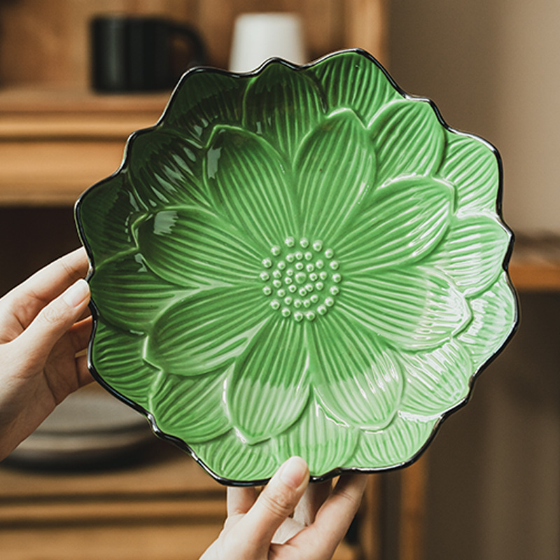 复古莲花盘陶瓷盘果盘浮雕花形盘家用盘子菜盘沙拉盘餐具摆件