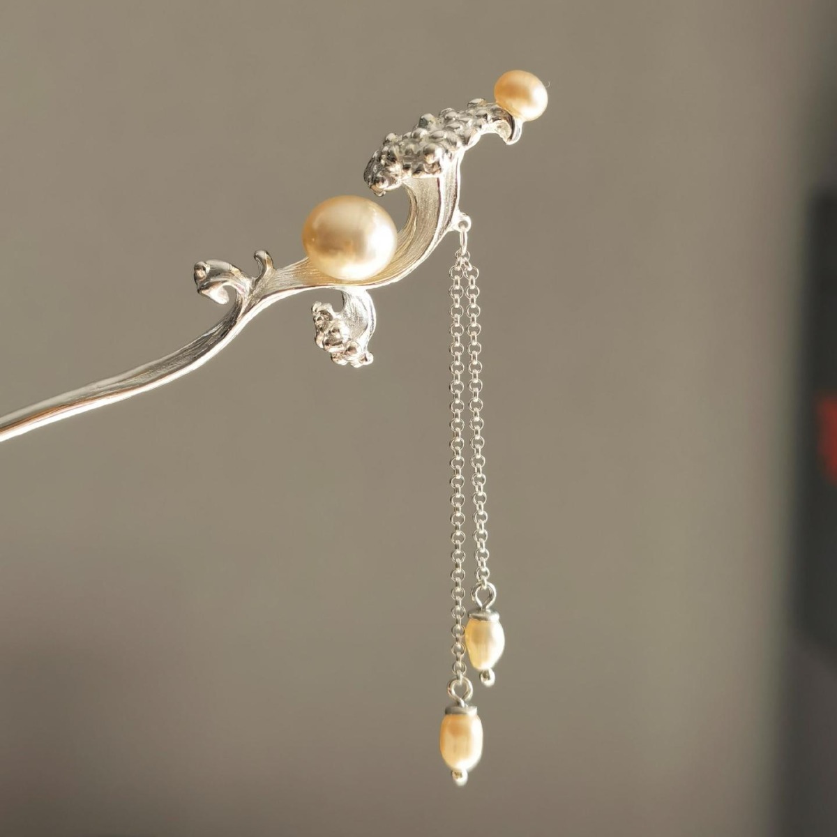 海誓山盟海浪珍珠流苏S925纯银发簪国潮复古原创设计情人节礼物