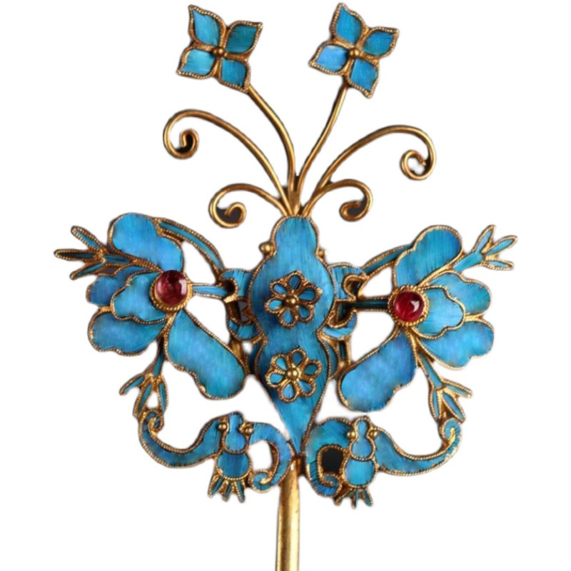 仿点翠蝴蝶发饰古风汉服旗袍盘发簪镀金复古风头饰中式配
