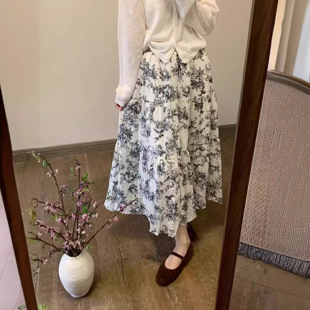 韩国东大门夏季夜玉兰透气轻薄新中式植绒碎花裙半身
