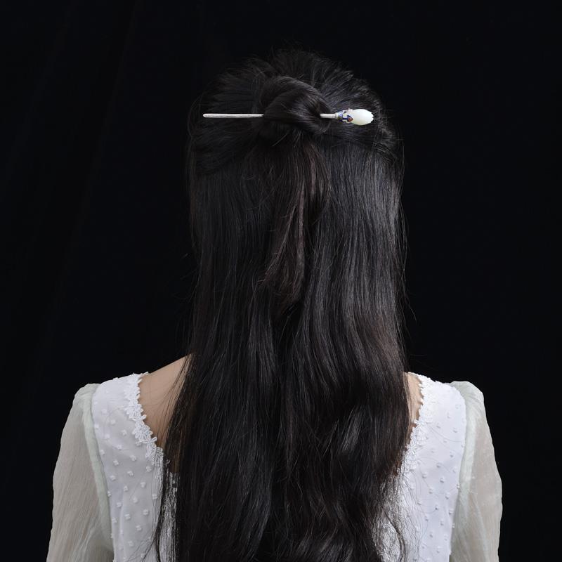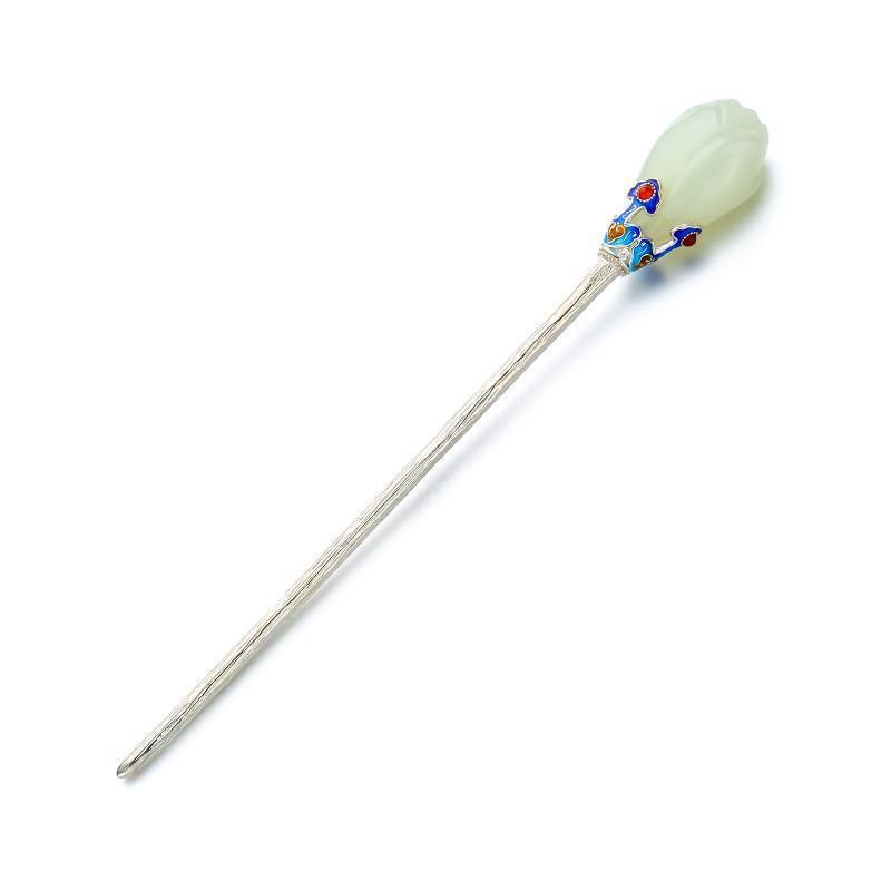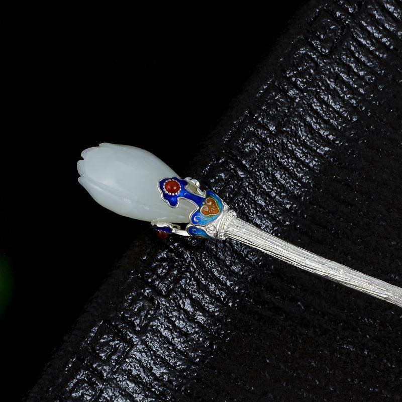 民族风玉兰花白玉纯银S925发簪女汉服头饰盘发钗景泰蓝发饰品旗袍