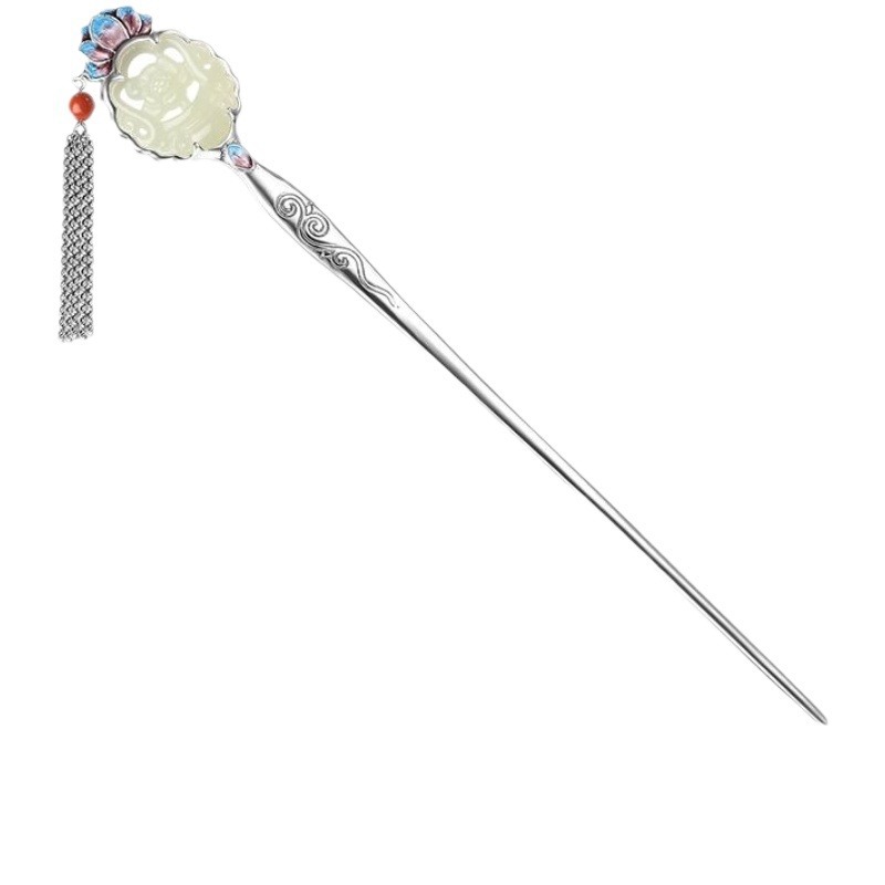 S925银发簪典雅文艺景泰工艺和田石莲花流苏长款银簪