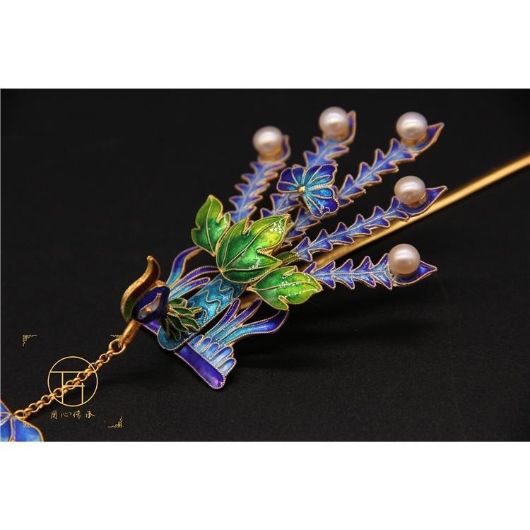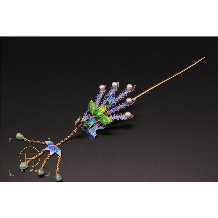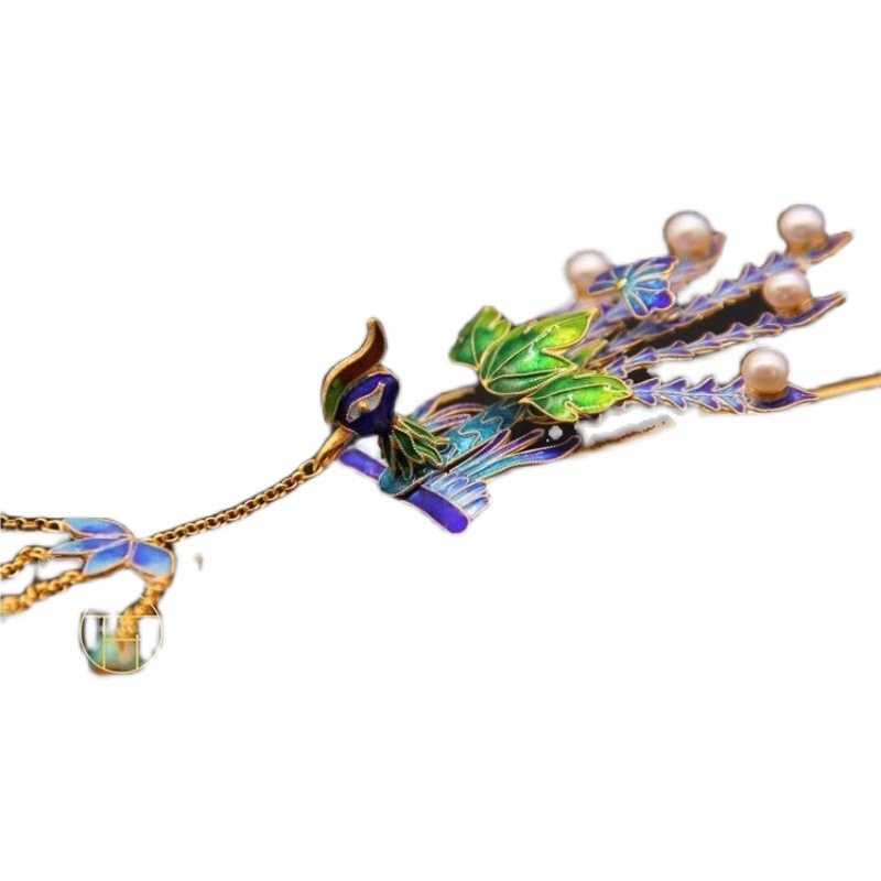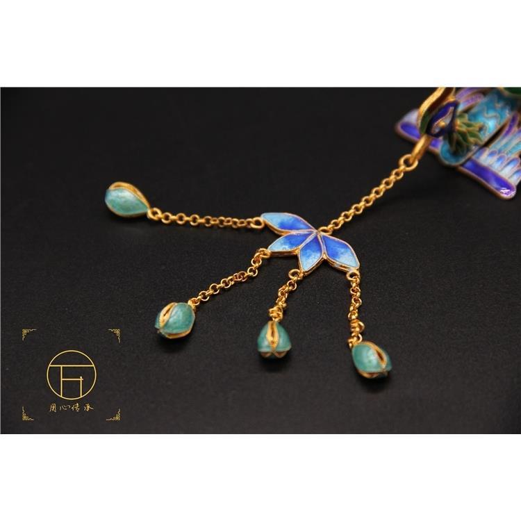 S925纯银古法手工明清烧蓝花丝珐琅彩凤凰发饰流苏发簪银鎏金簪子