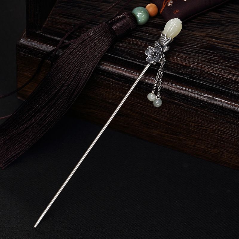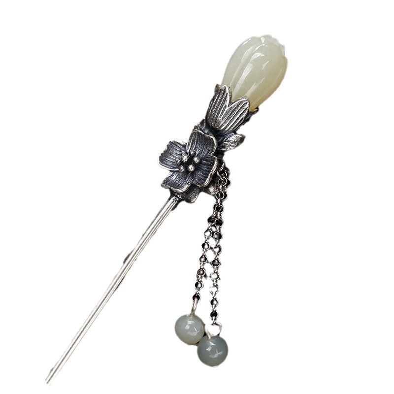 簪子女士古风S925纯银复古汉服盘发白玉兰花发簪旗袍头饰七夕礼物