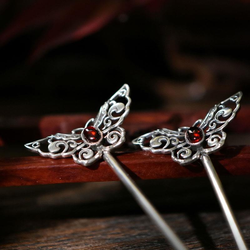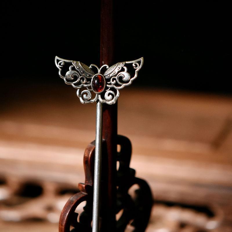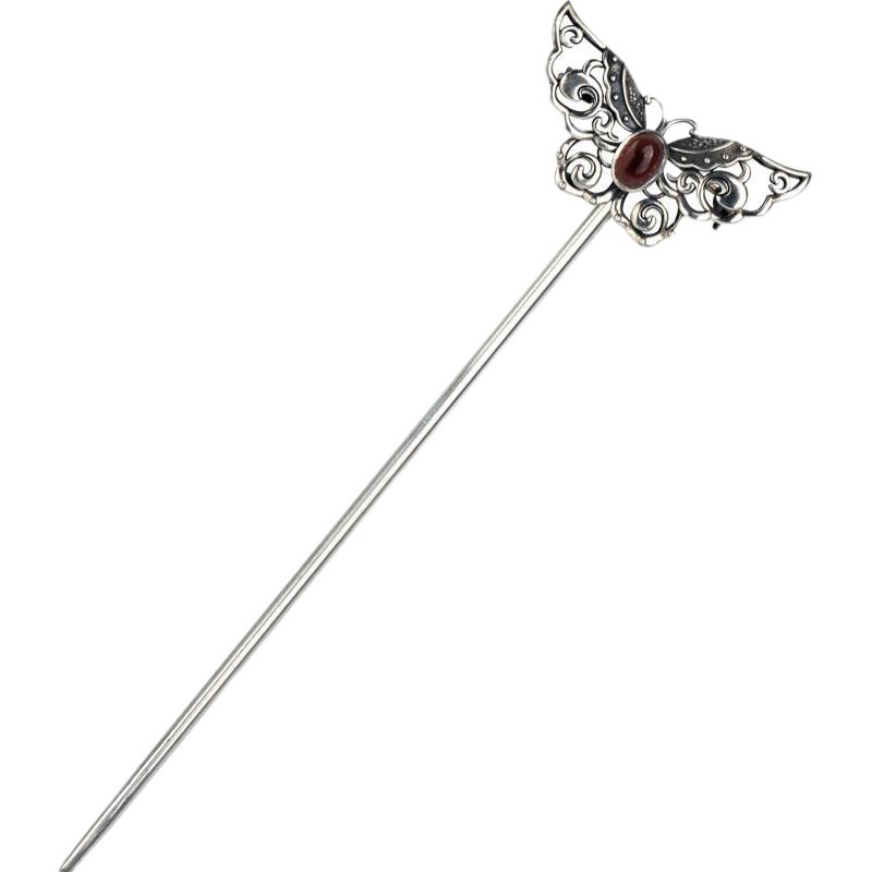 个性镀白金色发簪吉祥纹镶嵌石榴石汉服发髻头饰中国古风簪子礼物