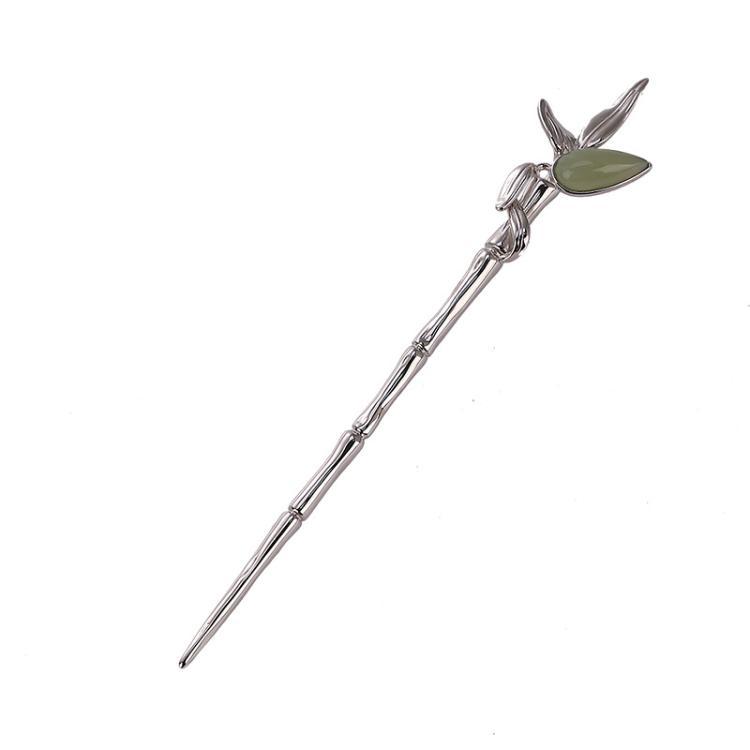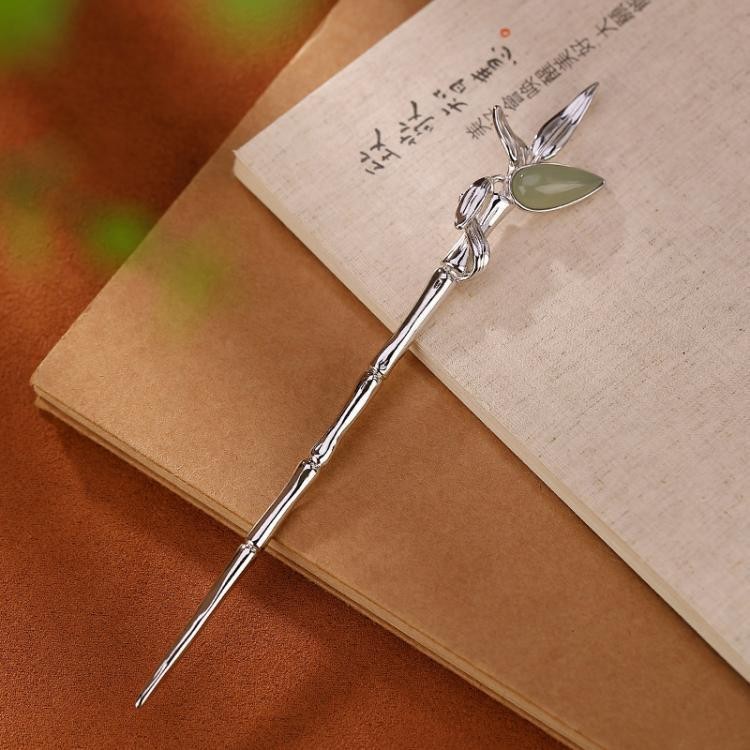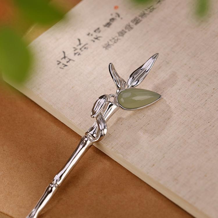 S925纯银镶青玉竹节发簪女款光面和田玉竹叶精美发饰盘发头饰簪子