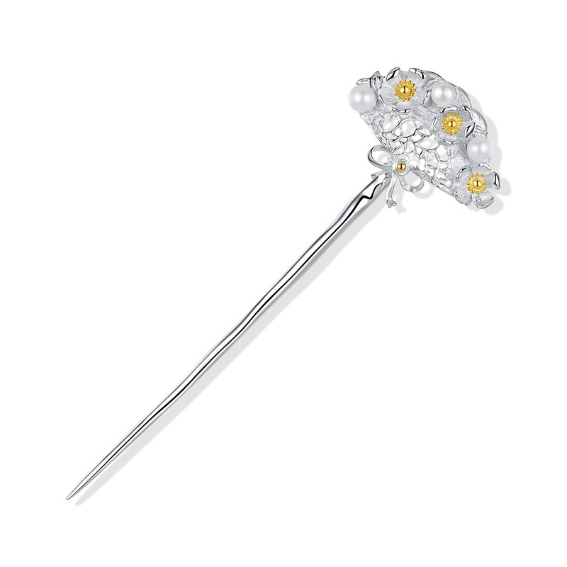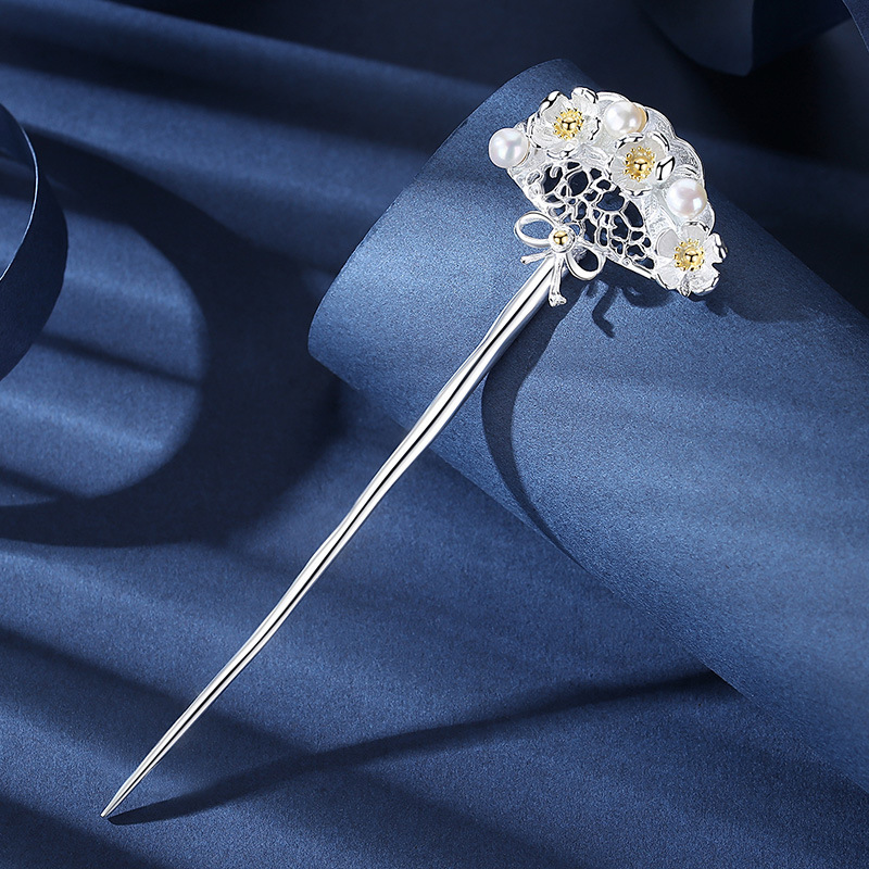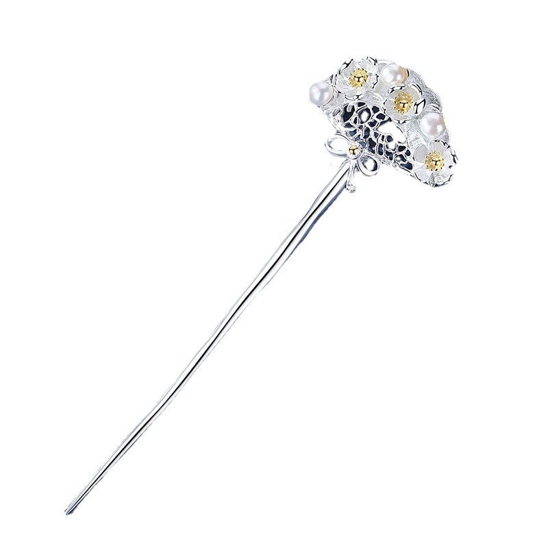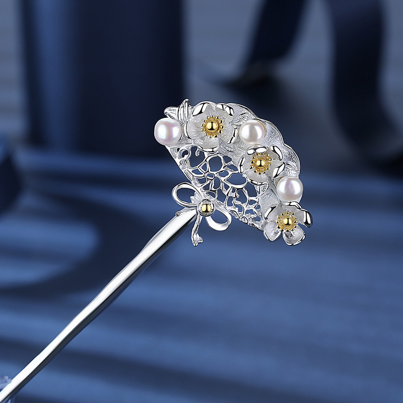盘头的发簪女古风汉服盘发百搭电金分色珍珠扇形一字簪子
