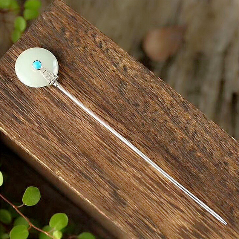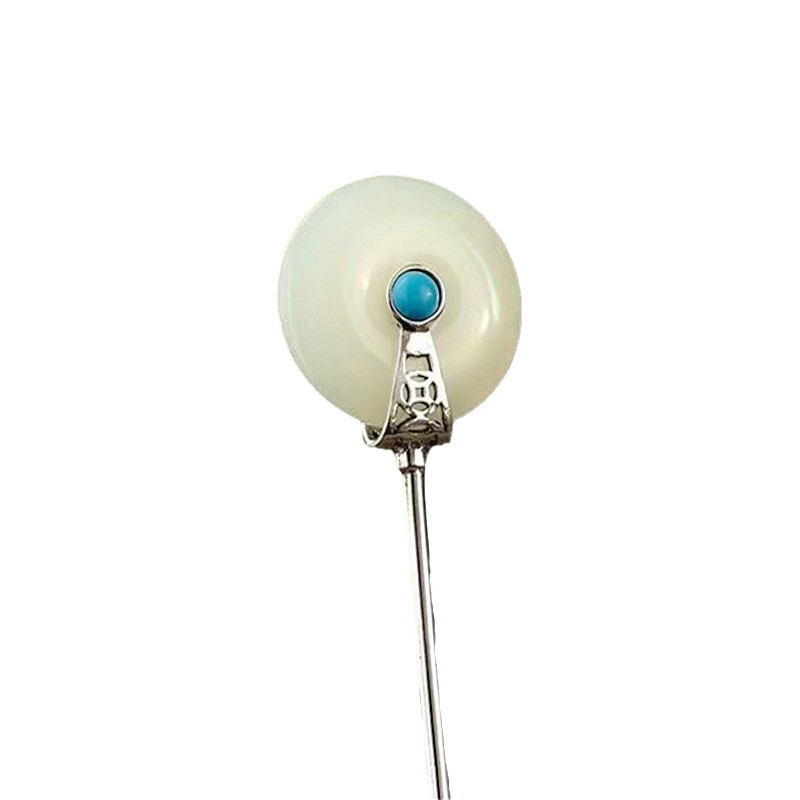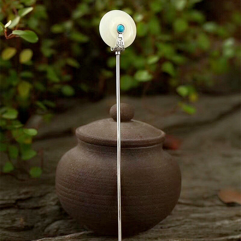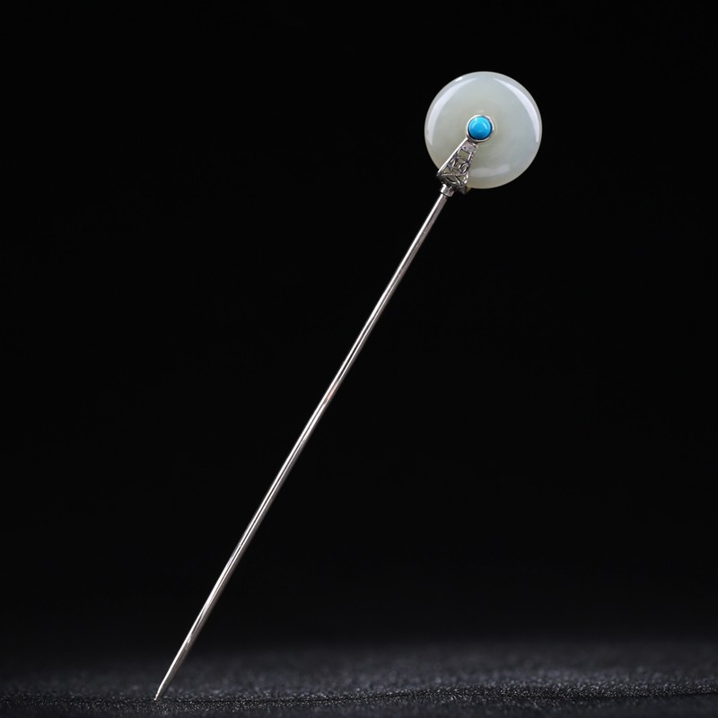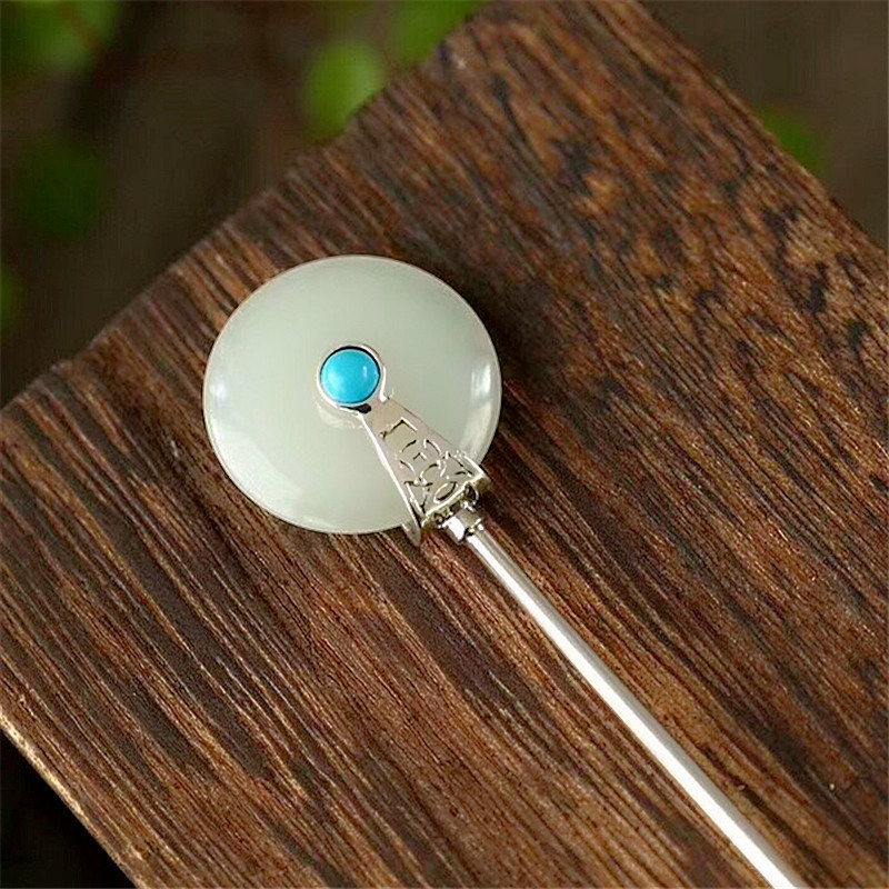 S925纯银镶嵌和田平安扣发簪女士复古风汉服绿松石原创设计簪子