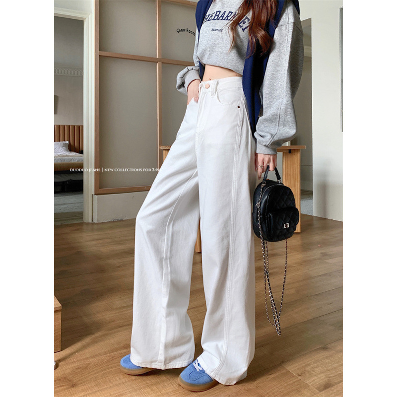 美式复古白色阔腿牛仔裤女高腰宽松显瘦直筒拖地长裤