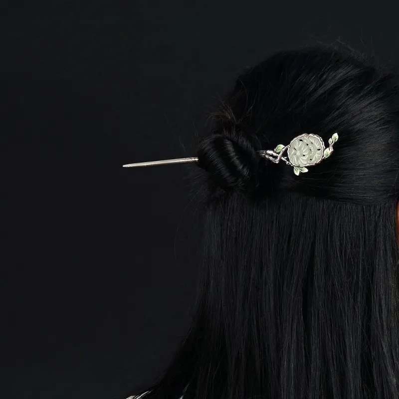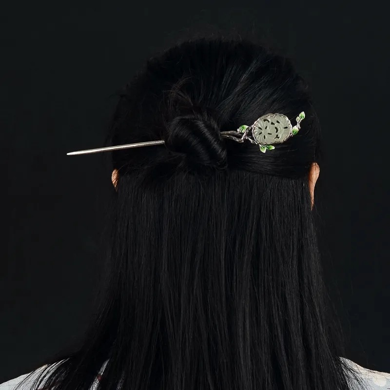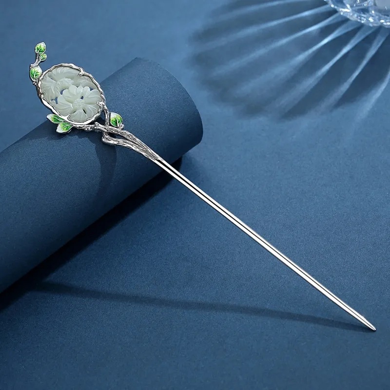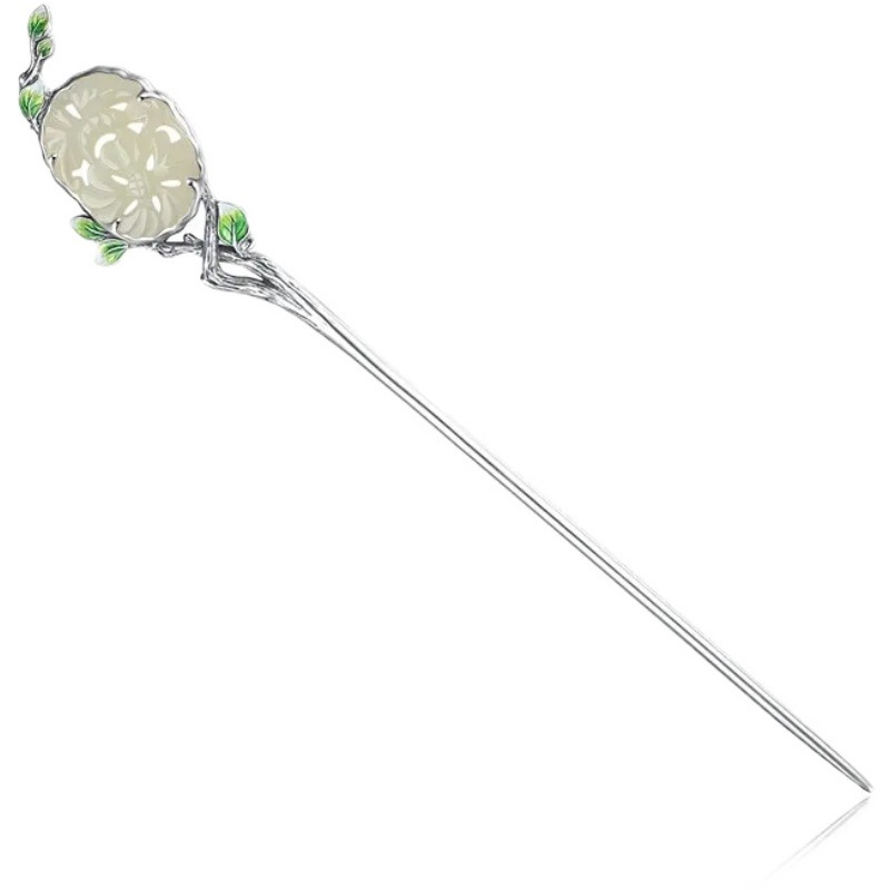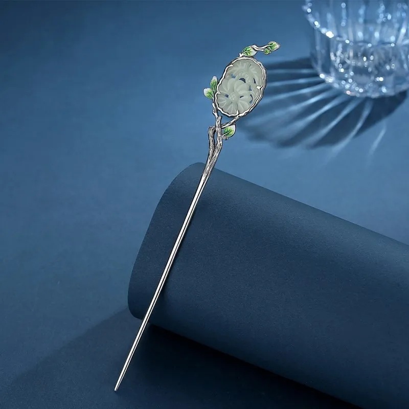s925银发簪古风汉服景泰蓝缠枝和田旗袍簪子女盘发一字素簪