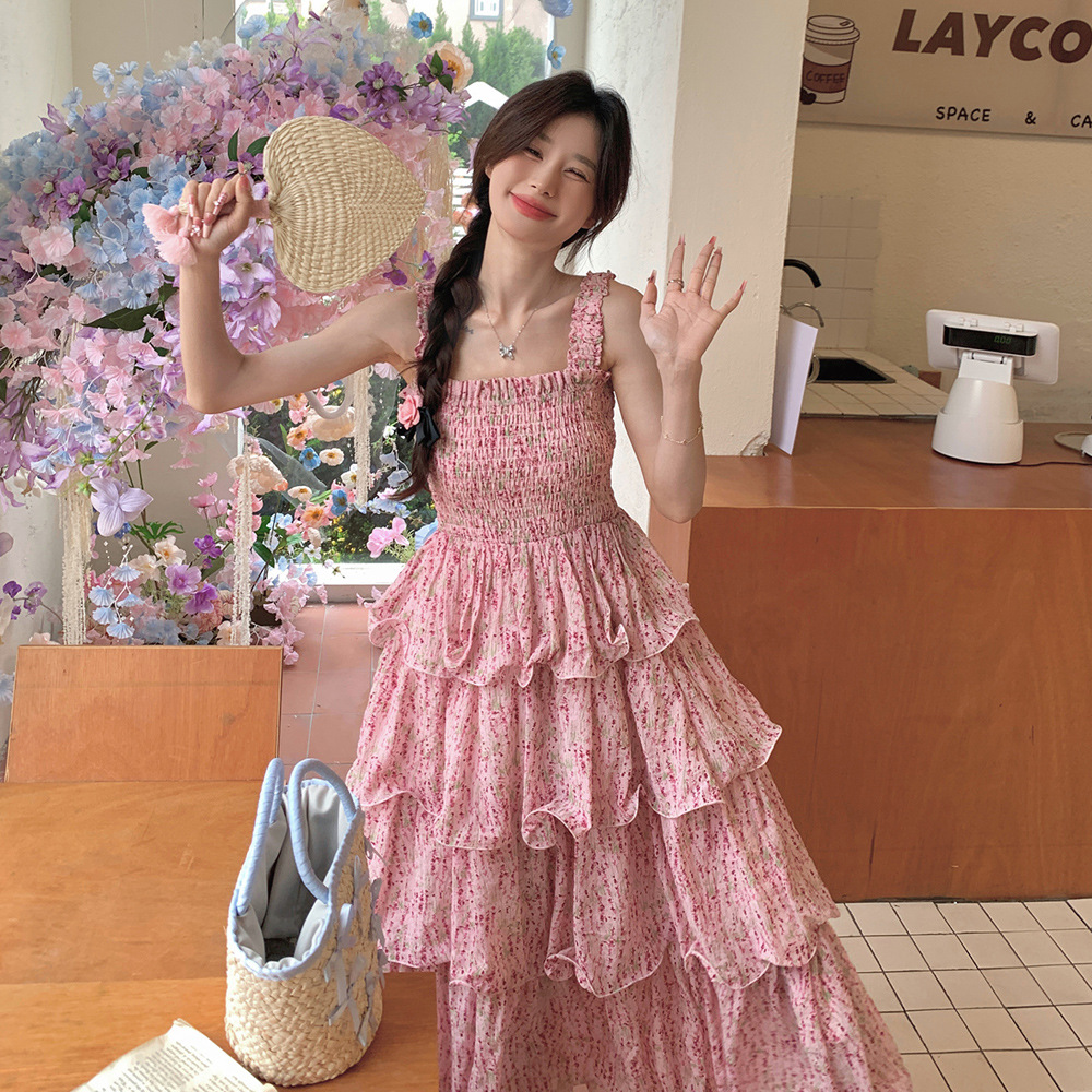 夏季新款法式度假碎花裙时尚高级蛋糕连衣裙显瘦气质吊带长裙