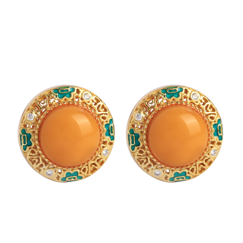 天然鸡油黄蜜蜡纯银平安扣珐琅彩耳钉女新中式国风金镶玉耳饰耳环