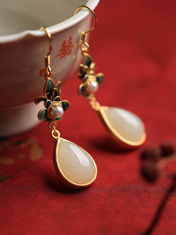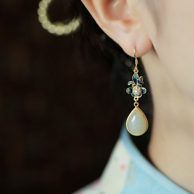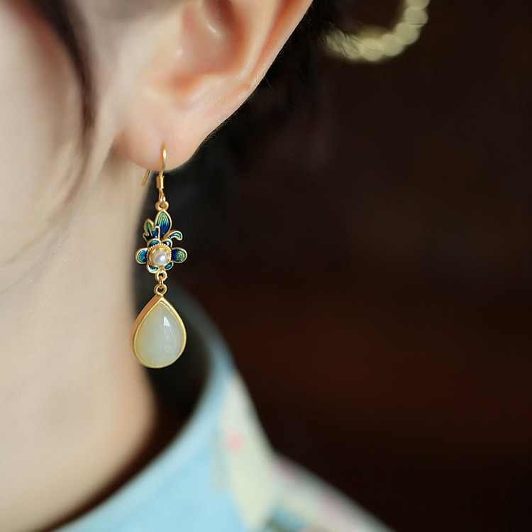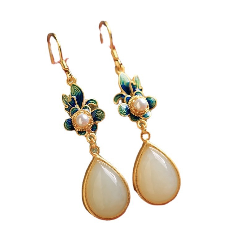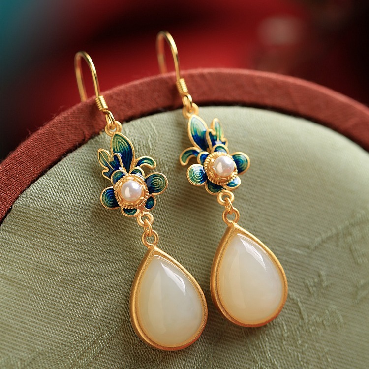 纯银古法金镶和田玉耳环女珐琅花朵中国风水滴长款耳饰耳坠