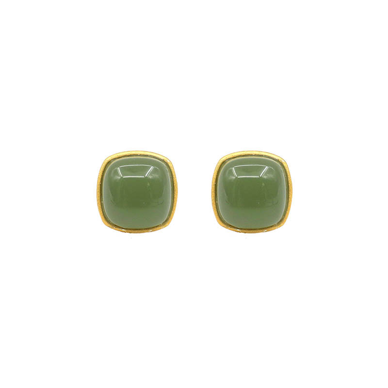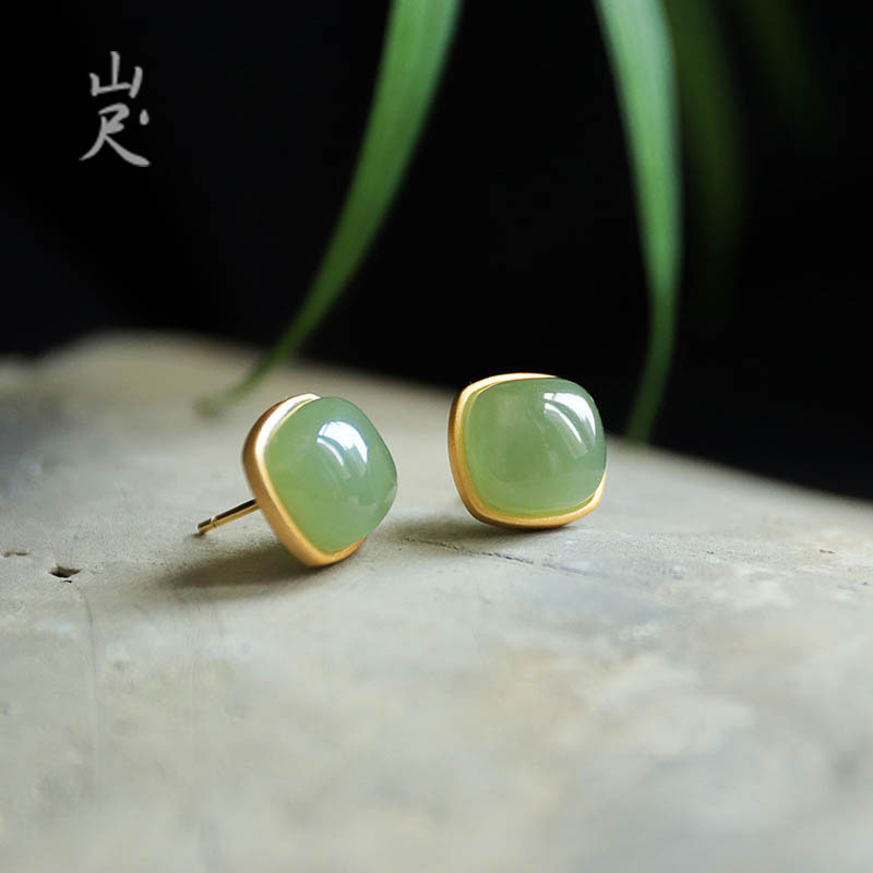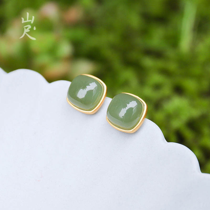 仲夏丨天然和田玉碧玉方形耳钉925纯银镀金耳环简约流行时尚耳饰