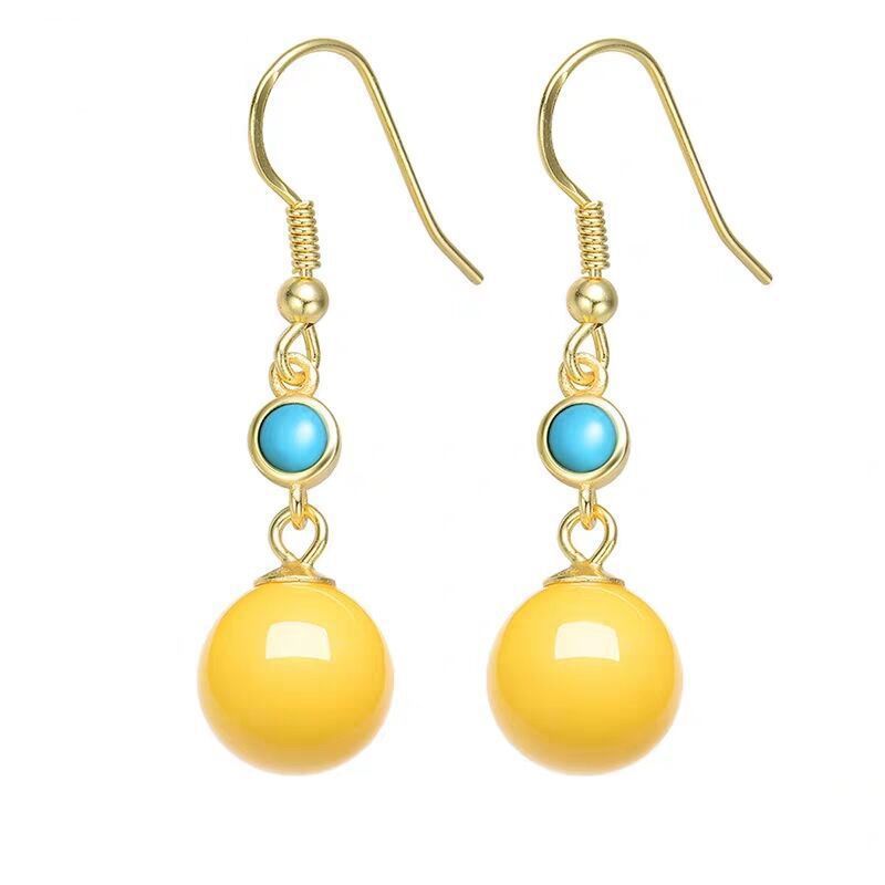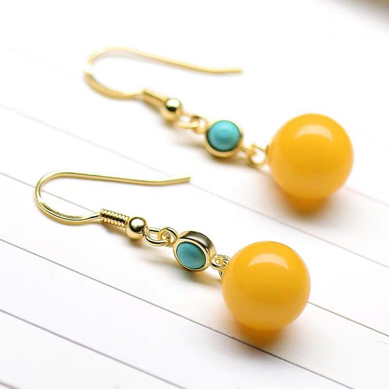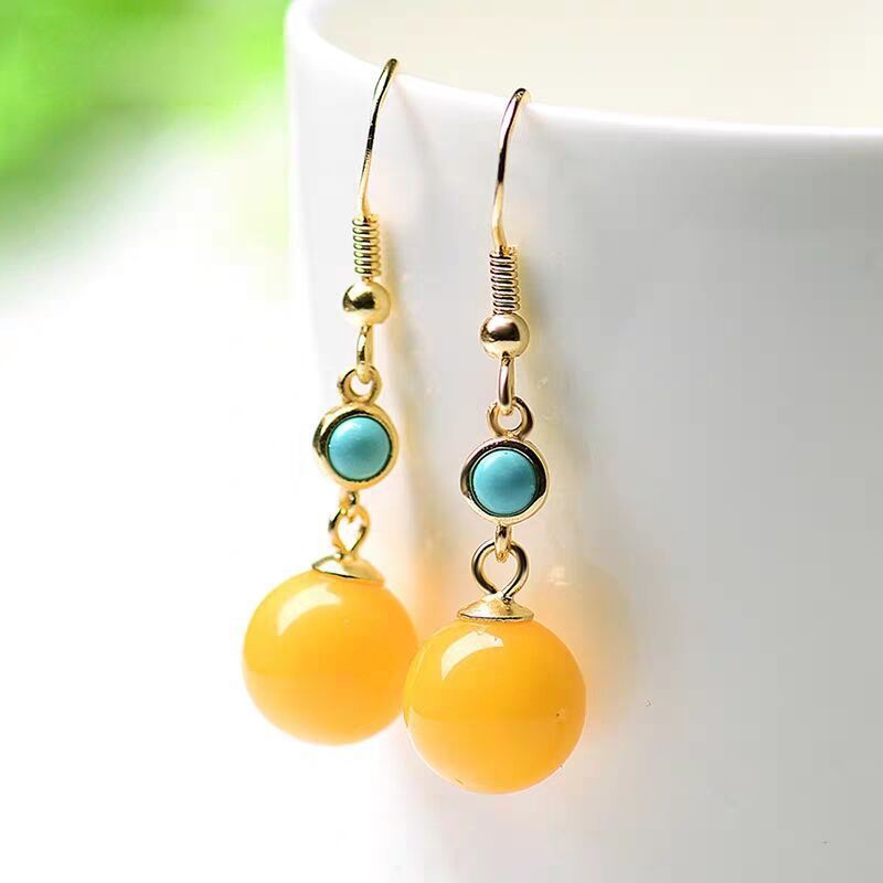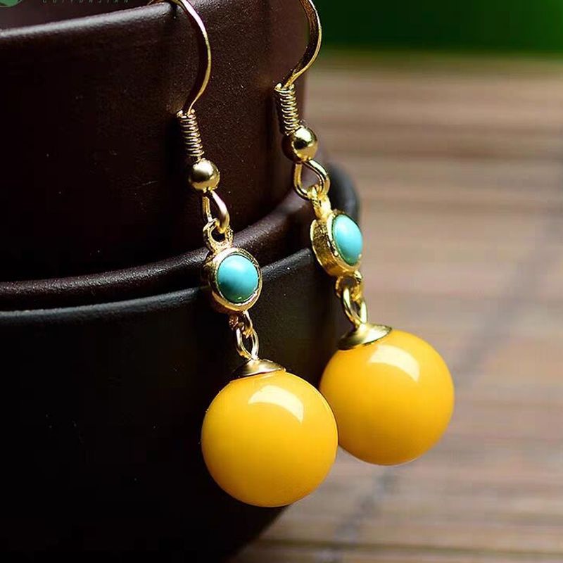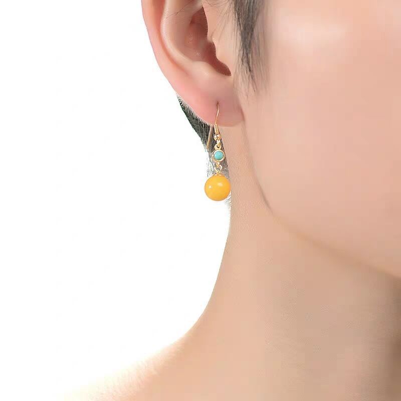 S925银镀金绿松石蜜蜡复古宫廷风中国风气质百搭小众女士耳环