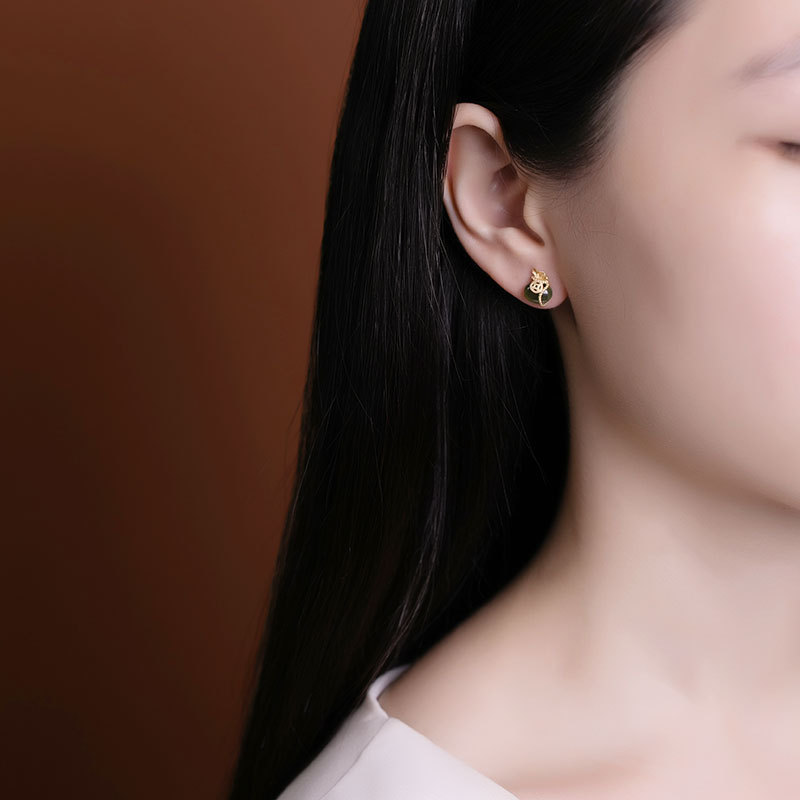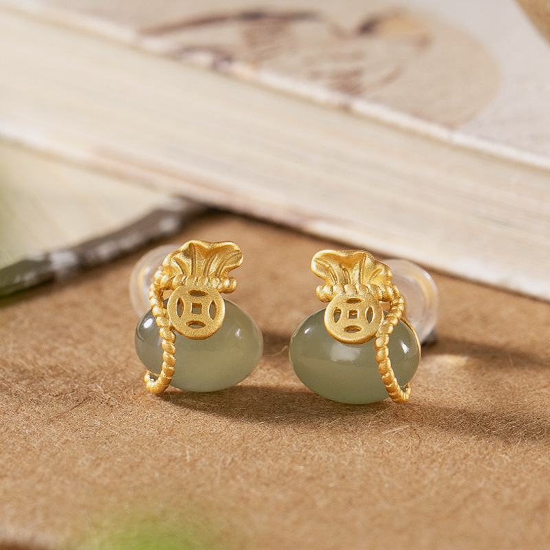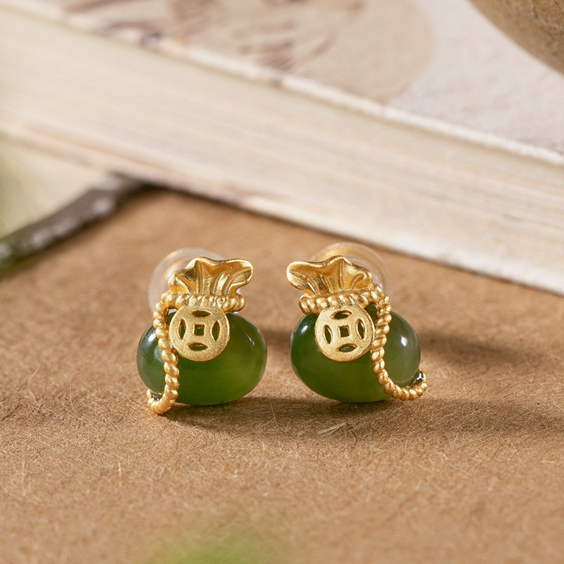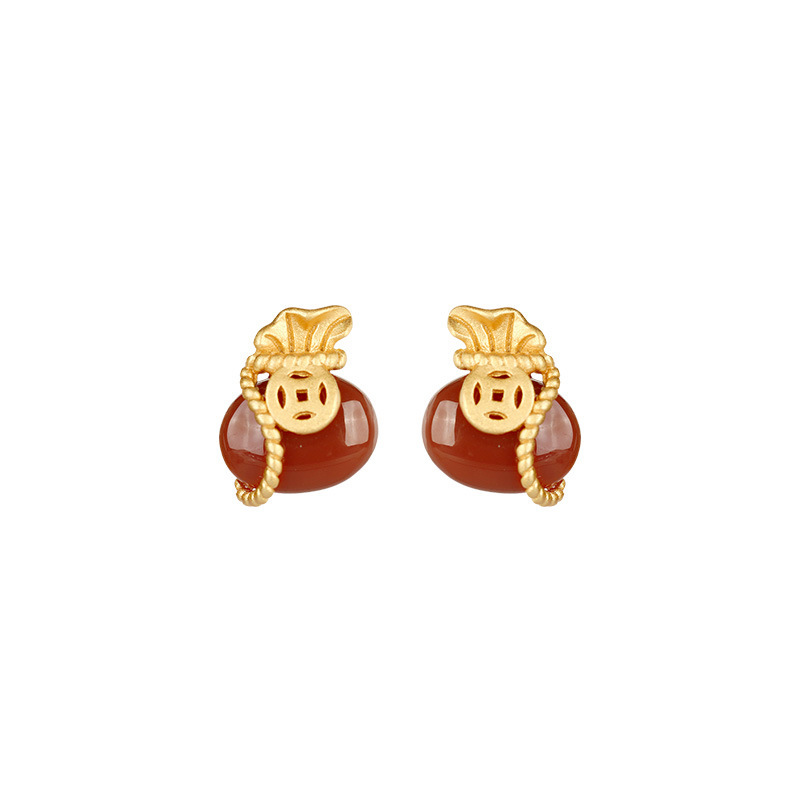 袋袋平安S925纯银镀金南红玛瑙和田玉古典中式福袋钱袋女耳钉耳饰