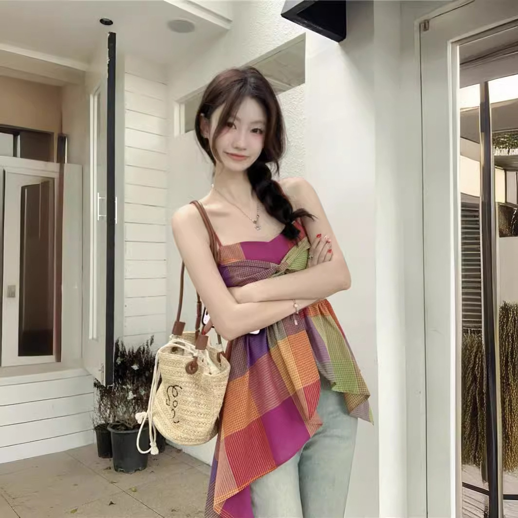 复古甜辣格子吊带背心女夏季新款撞色蝴蝶结不规则小众别致上衣潮