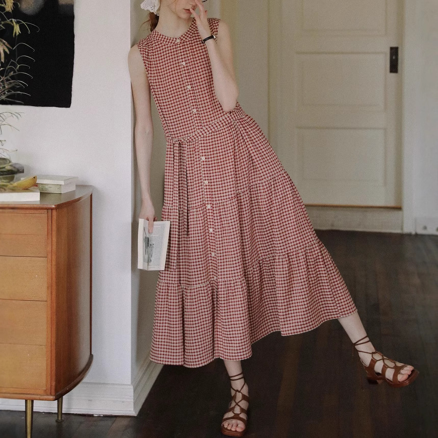 MELLIY 2025年新款法式复古高腰蛋糕裙女夏季无袖格纹系带衬衫裙
