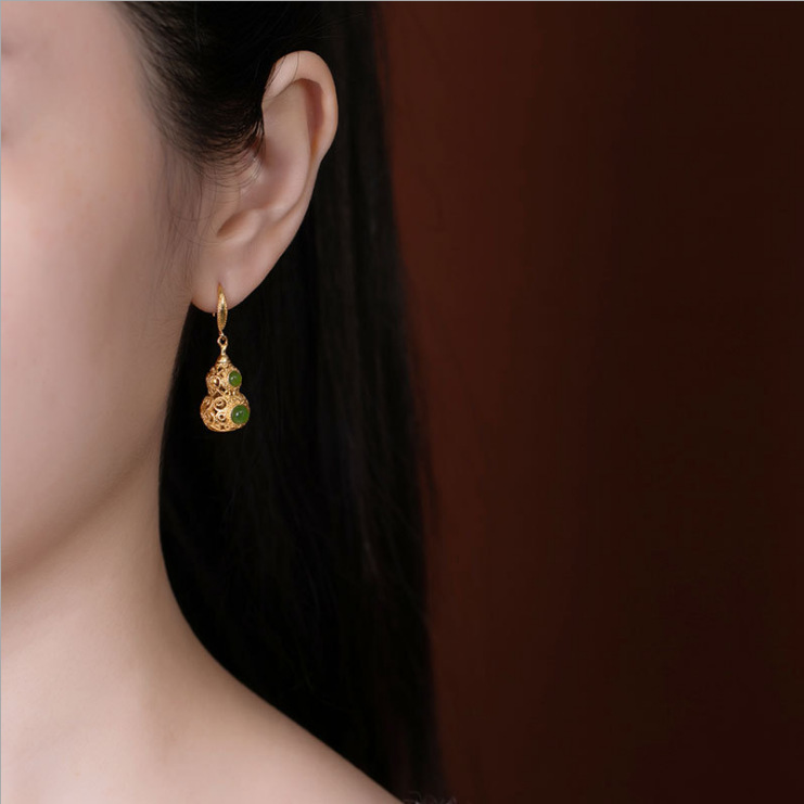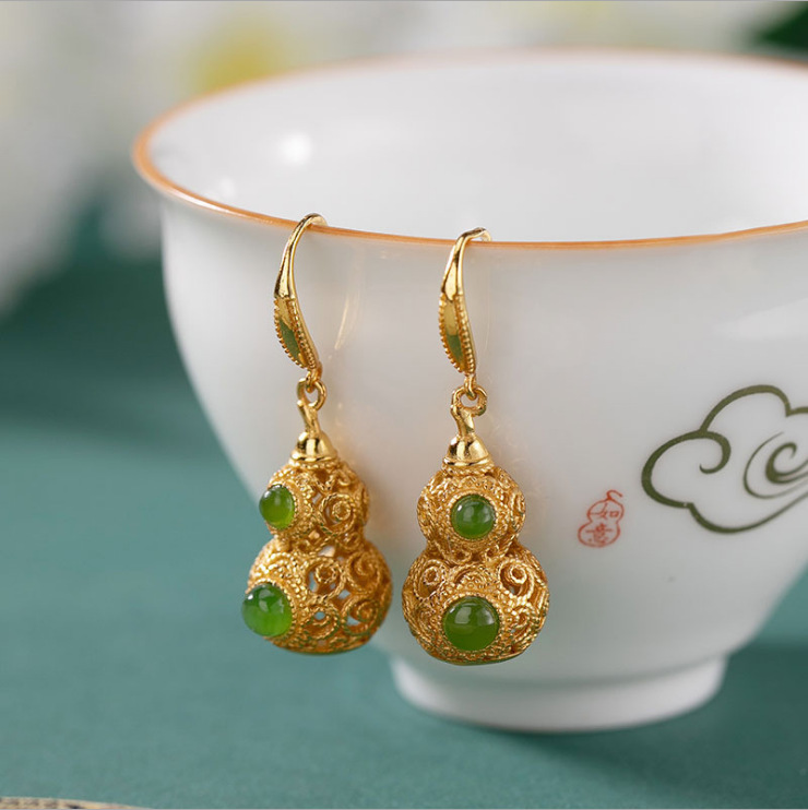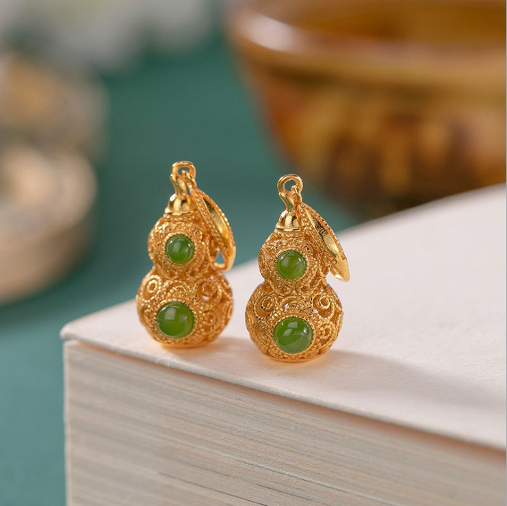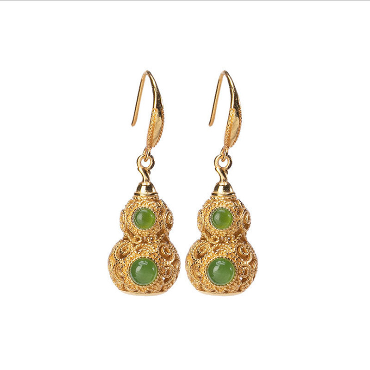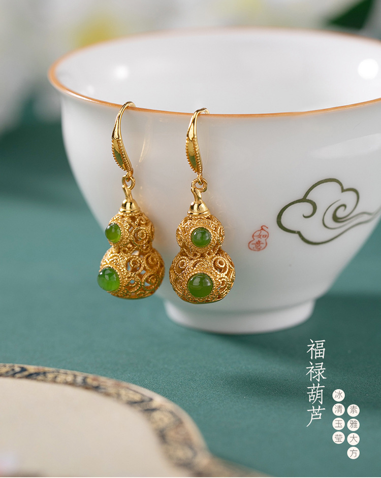 和田碧玉镂空葫芦耳坠925银防过敏金镶玉石耳环生日礼物宫廷风