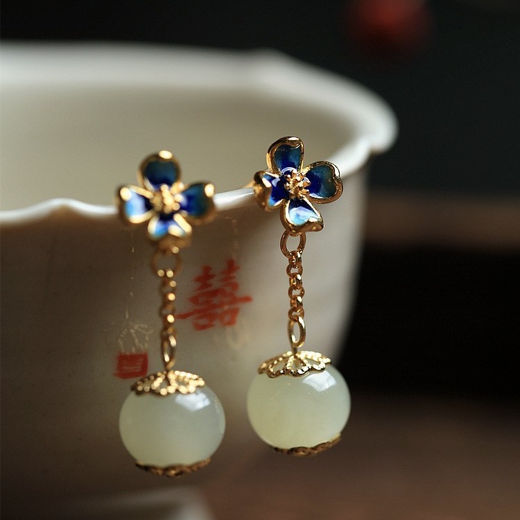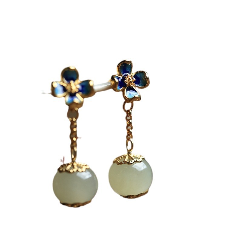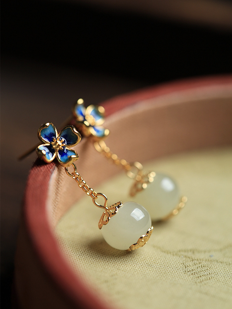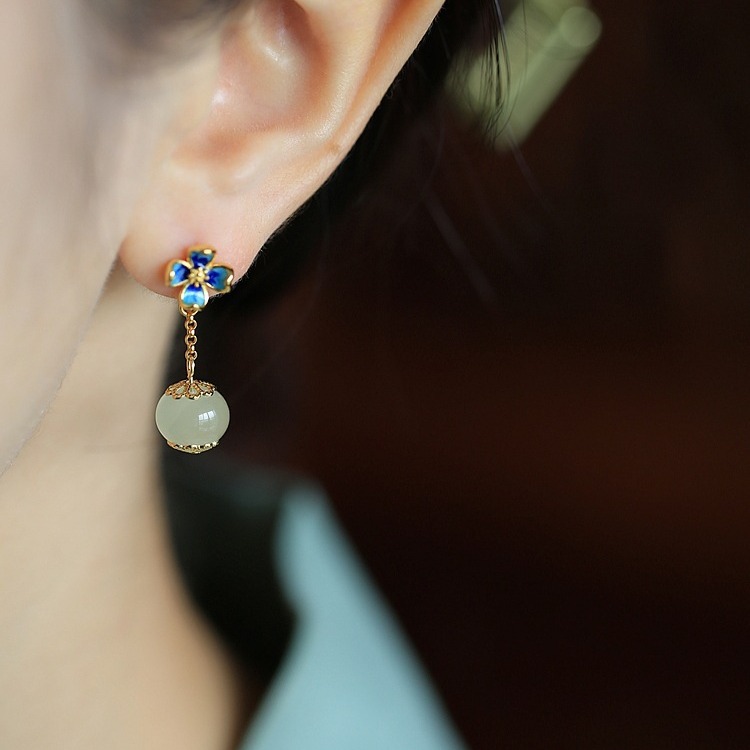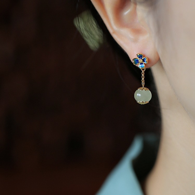 和田玉高级感四叶草纯银耳环女小众设计感轻奢花朵耳饰耳坠