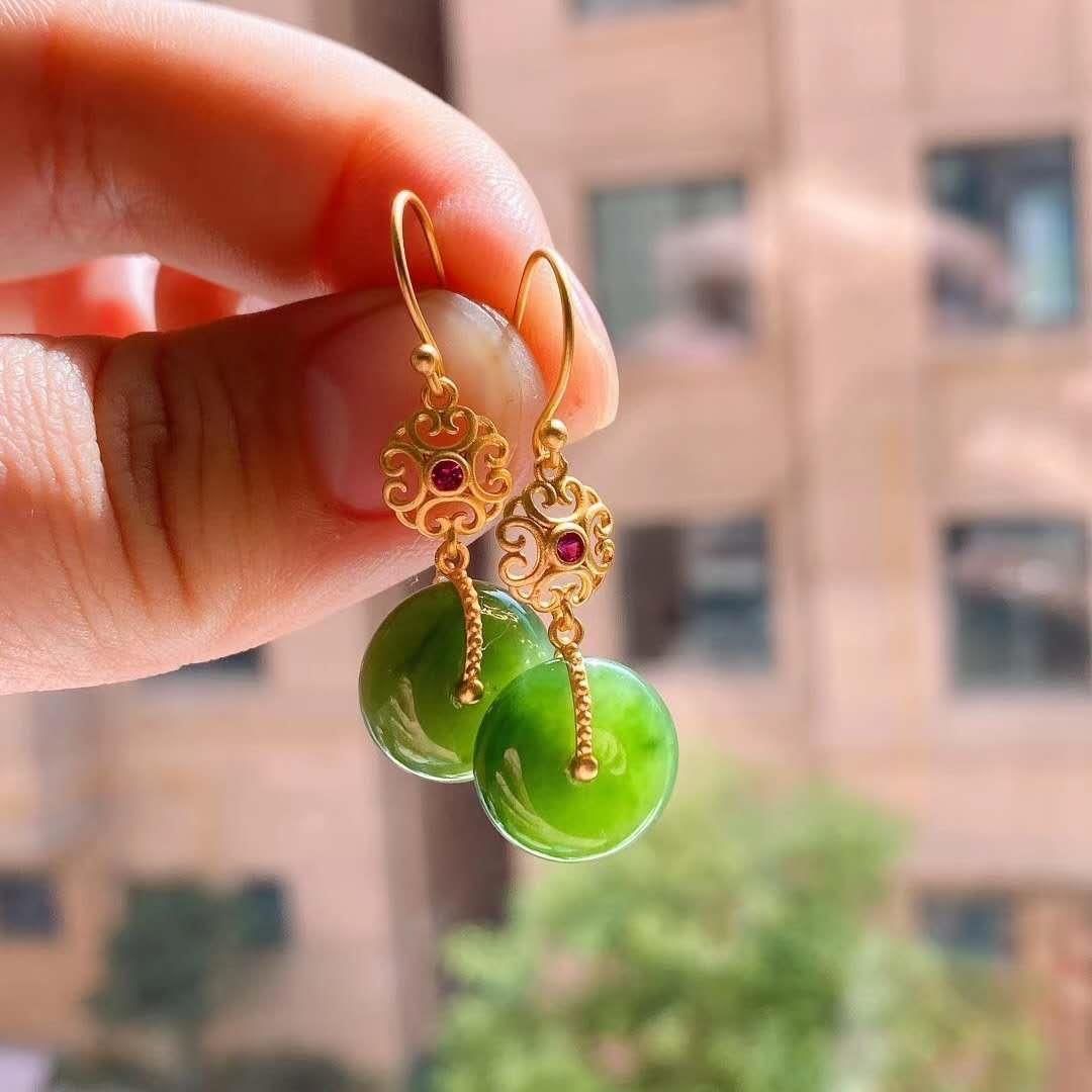 复古风S925纯银镶嵌天然和田青玉平安扣耳环吉祥如意镂空简约大方