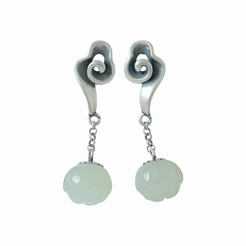 纯银s925银天然和田祥云莲花莲蓬耳环耳坠女民族宫廷风耳环