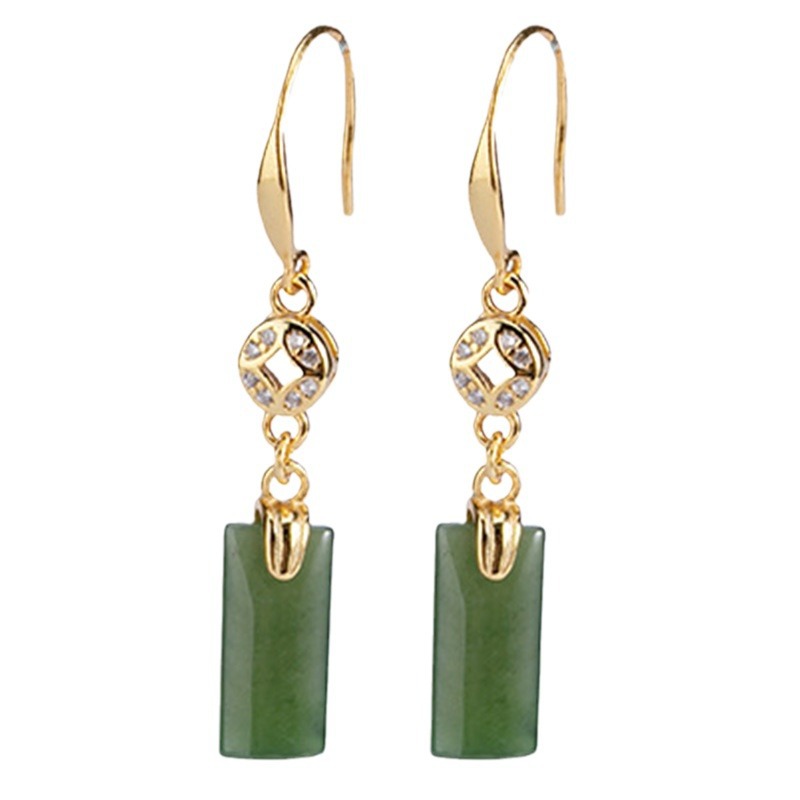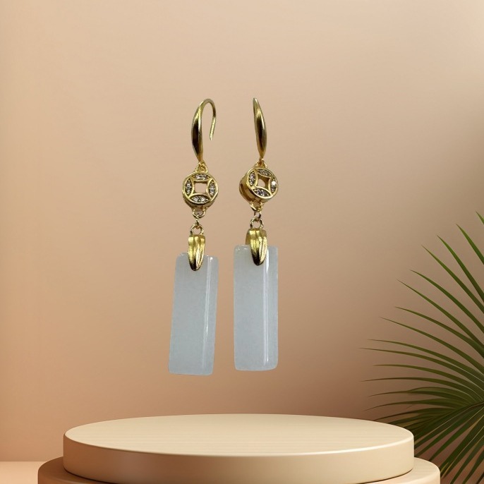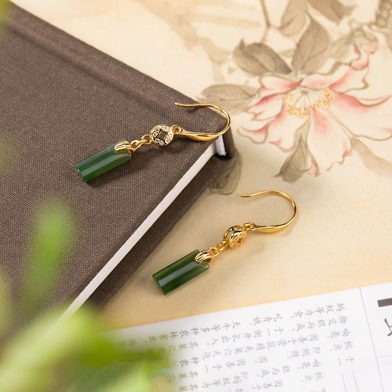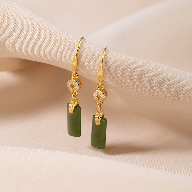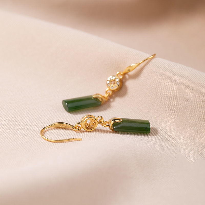 S925纯银个性钱币耳环高档镶嵌天然和田玉碧玉女耳坠耳饰品防过敏