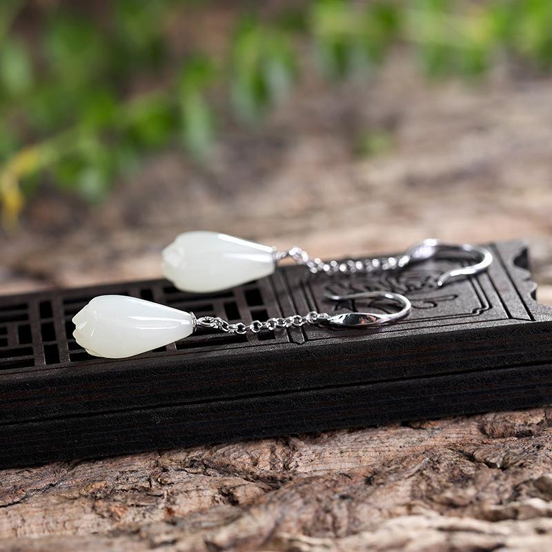 国风气质耳饰S925银镶天然玉玉兰花耳坠高档简约百搭女耳环