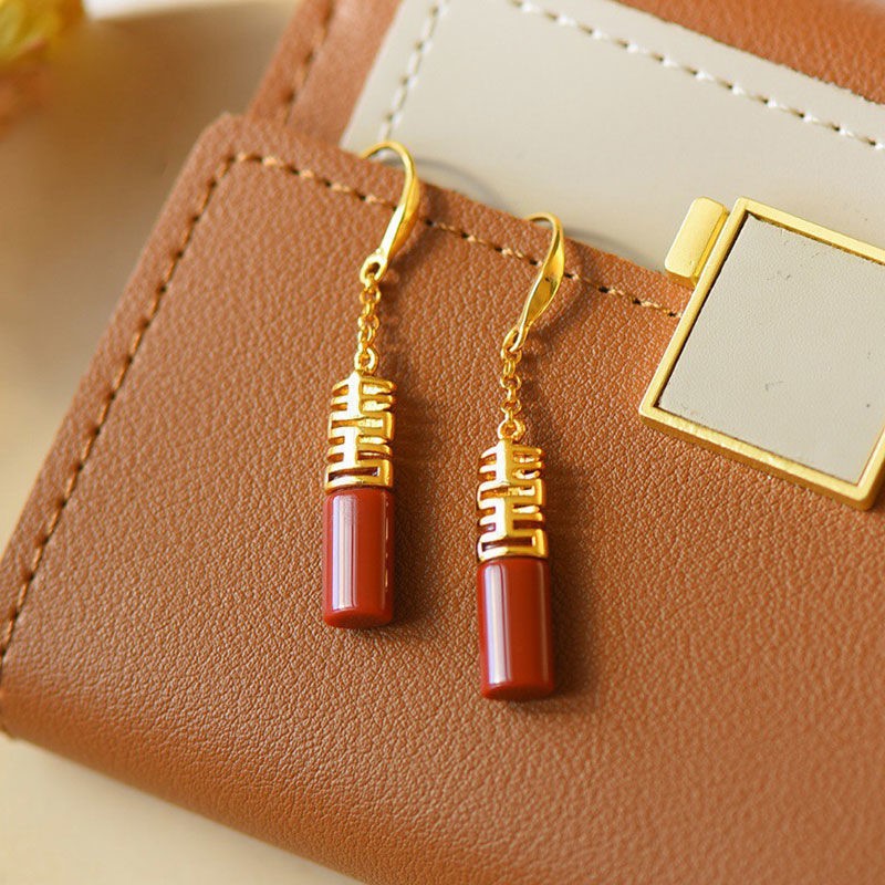 新品上新 民族国风耳饰s925银镀金饰品和田青玉喜字耳坠 长款耳环