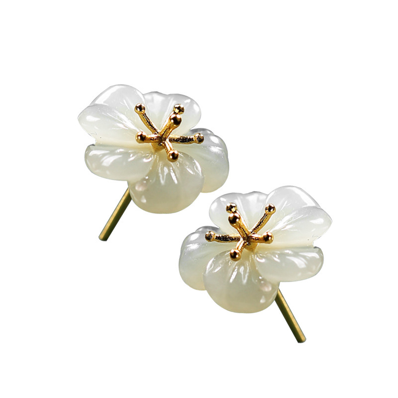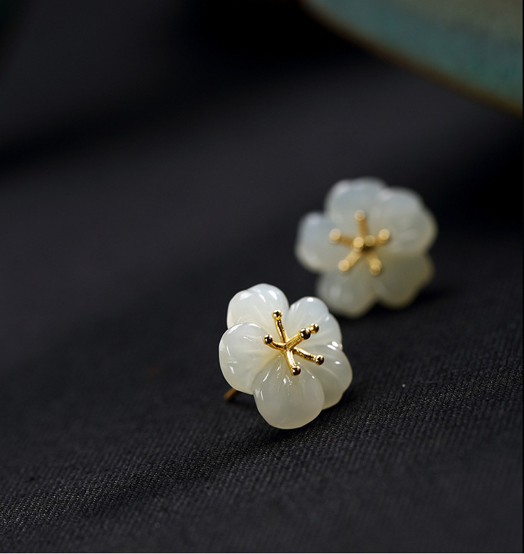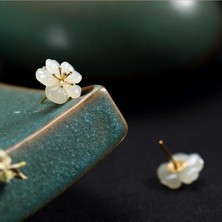 S925纯银鎏金梅花和田玉镶嵌耳钉梅开五福银耳饰女生高档白玉耳环