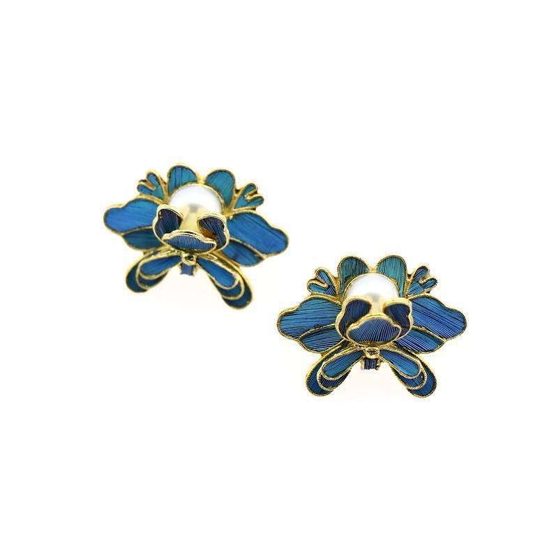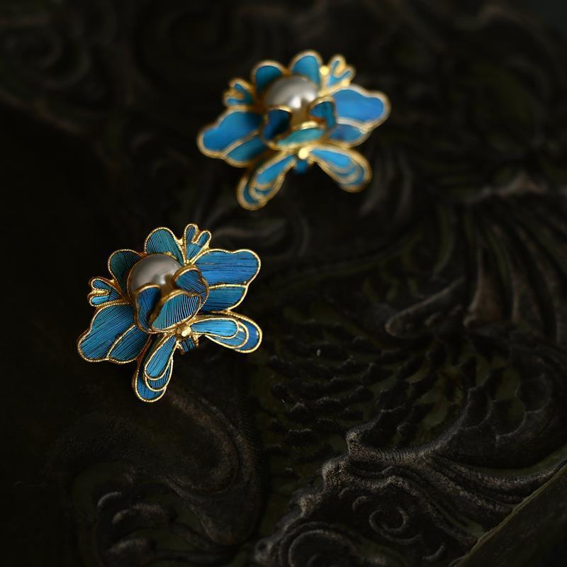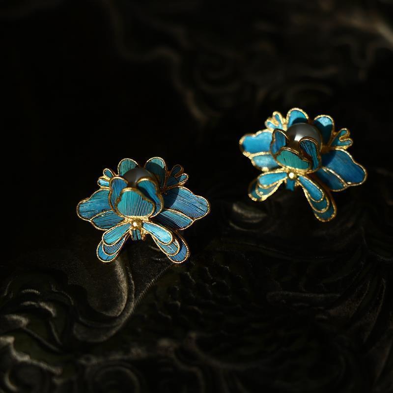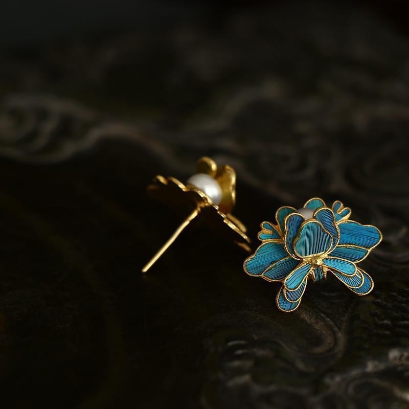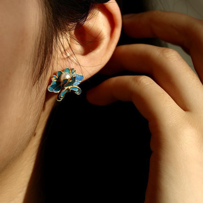 景泰蓝珍珠耳钉手工故宫传统首饰耳饰纯银鎏金古风汉服饰品