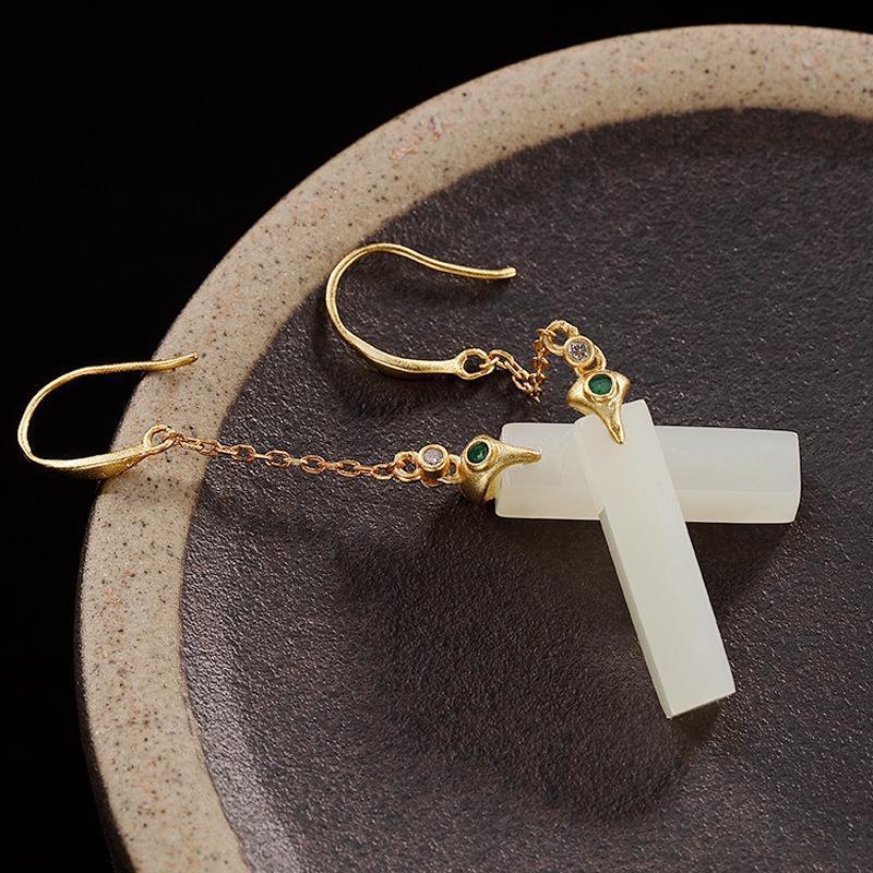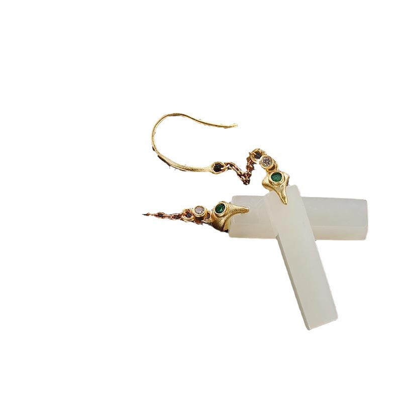 方形简约白玉耳饰女镀925银针宫廷风气质耳坠长款耳环配旗袍饰