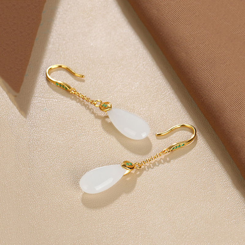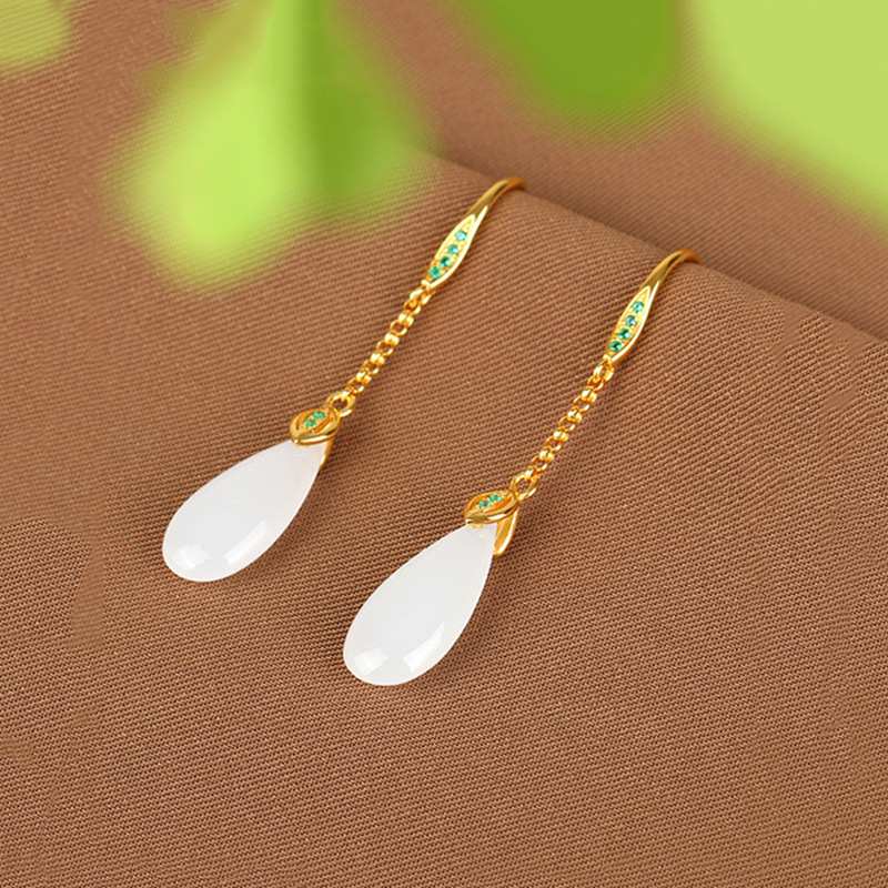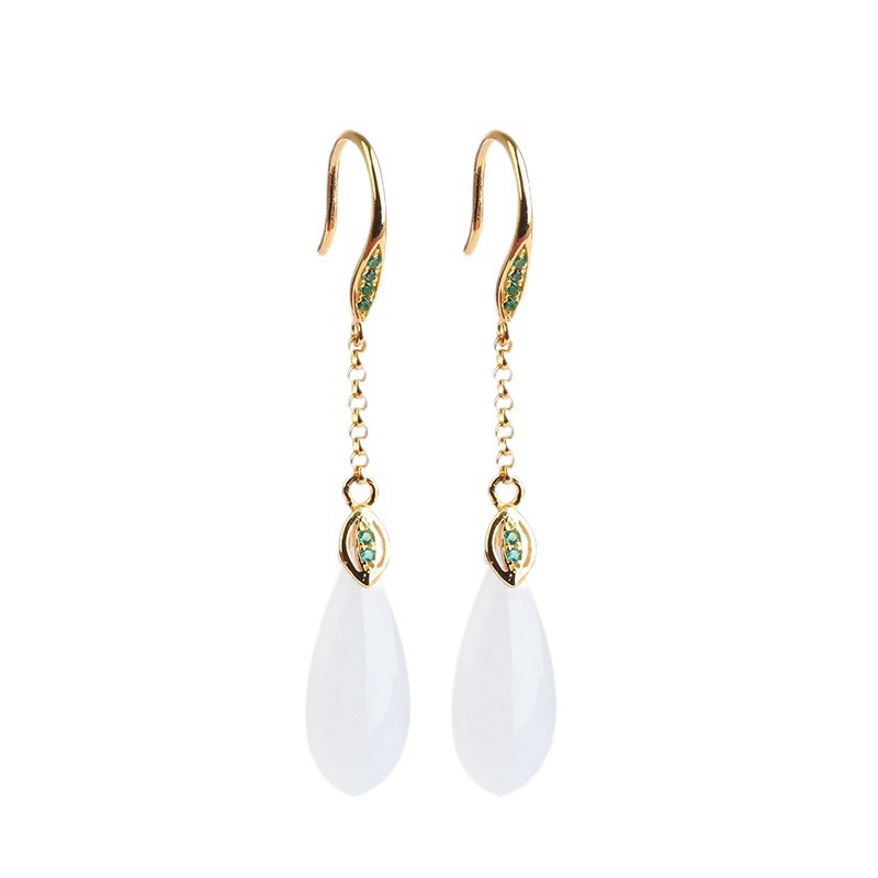s925纯银镀金镶嵌和田美玉耳环轻奢设计几何镀金锆石时尚百搭耳饰