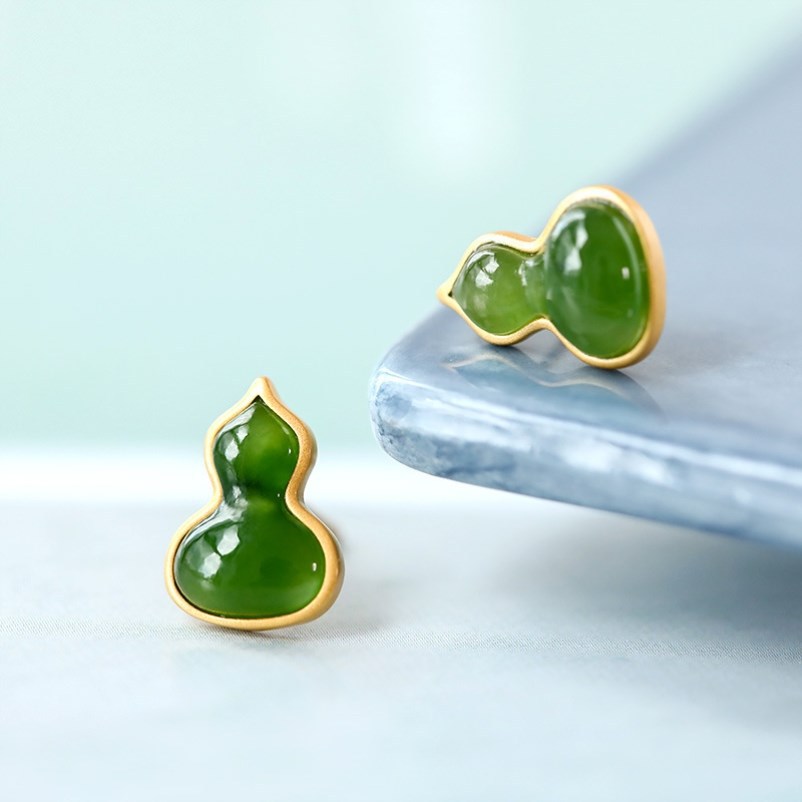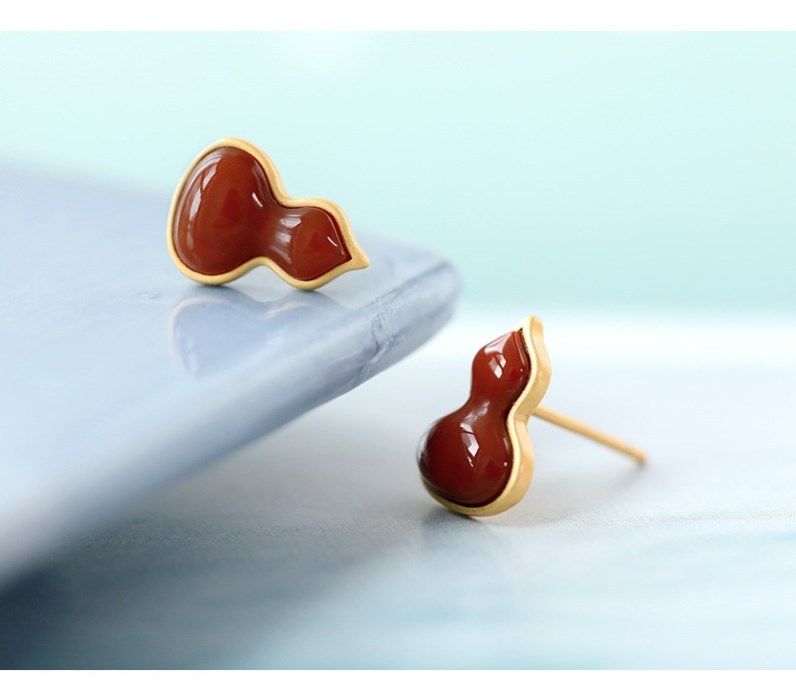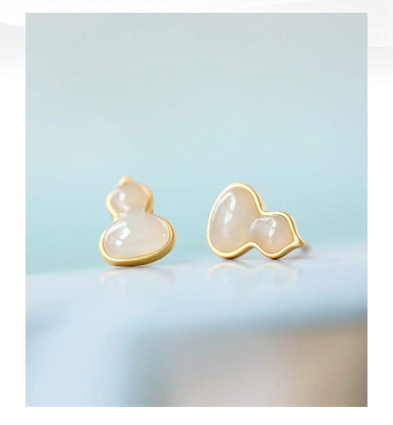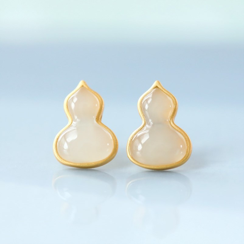 和田玉碧玉南红玛瑙葫芦耳钉女时尚气质简约复古风耳环纯银玉耳饰