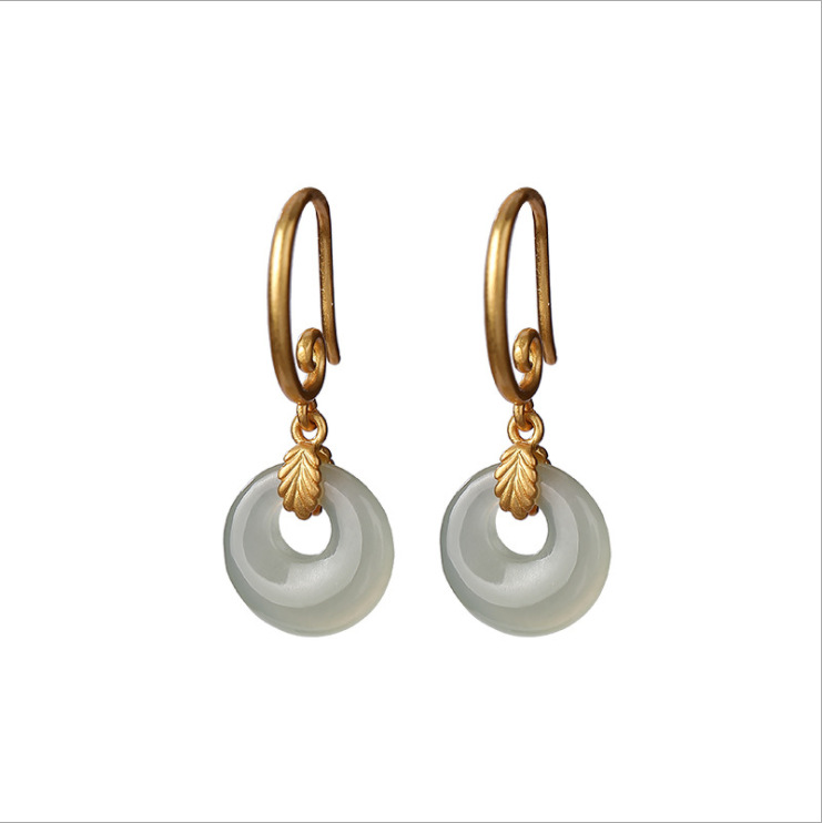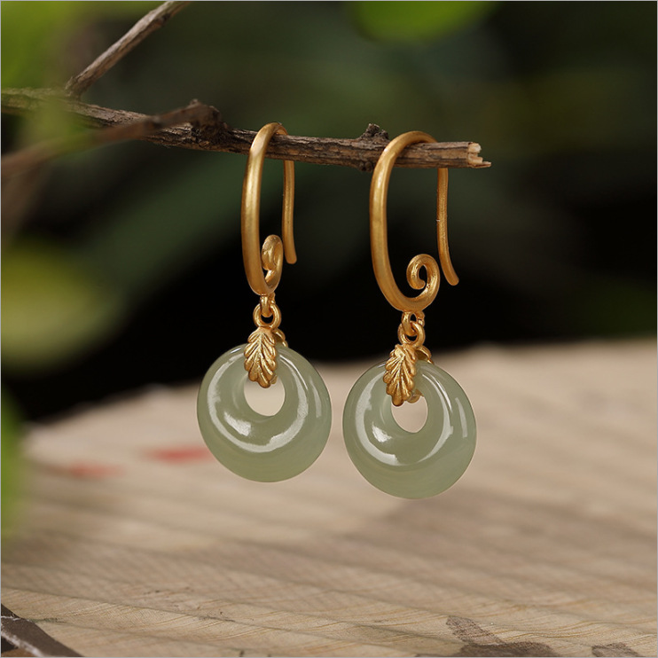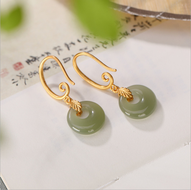 新中式和田耳环女s925纯银葫芦平安扣耳复古宫廷风玉石耳环