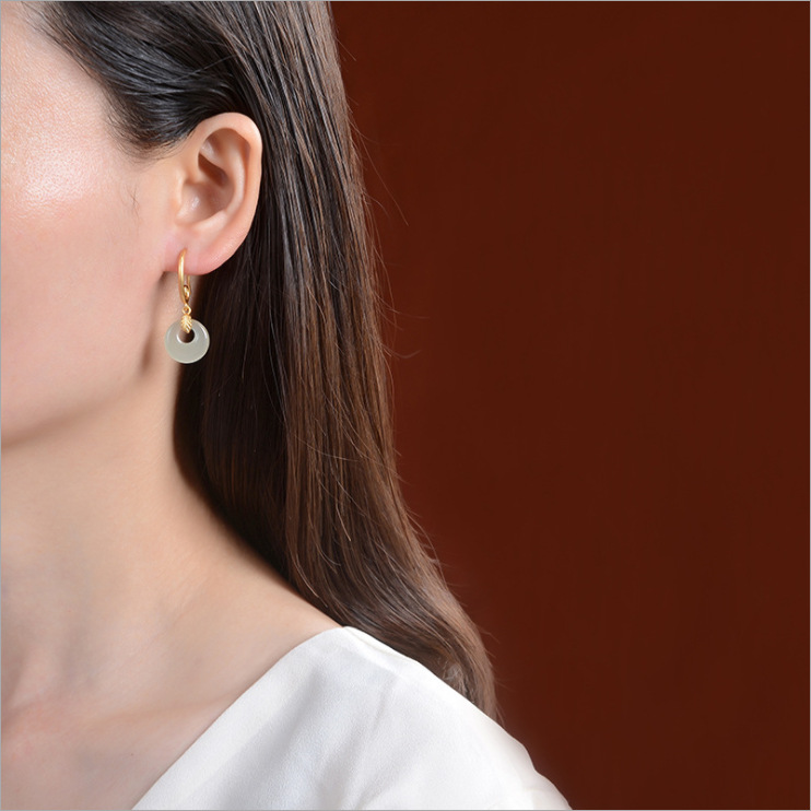 纯银镀金和田玉复古气质简约耳坠耳饰玉髓蛋面耳钉镶嵌耳环