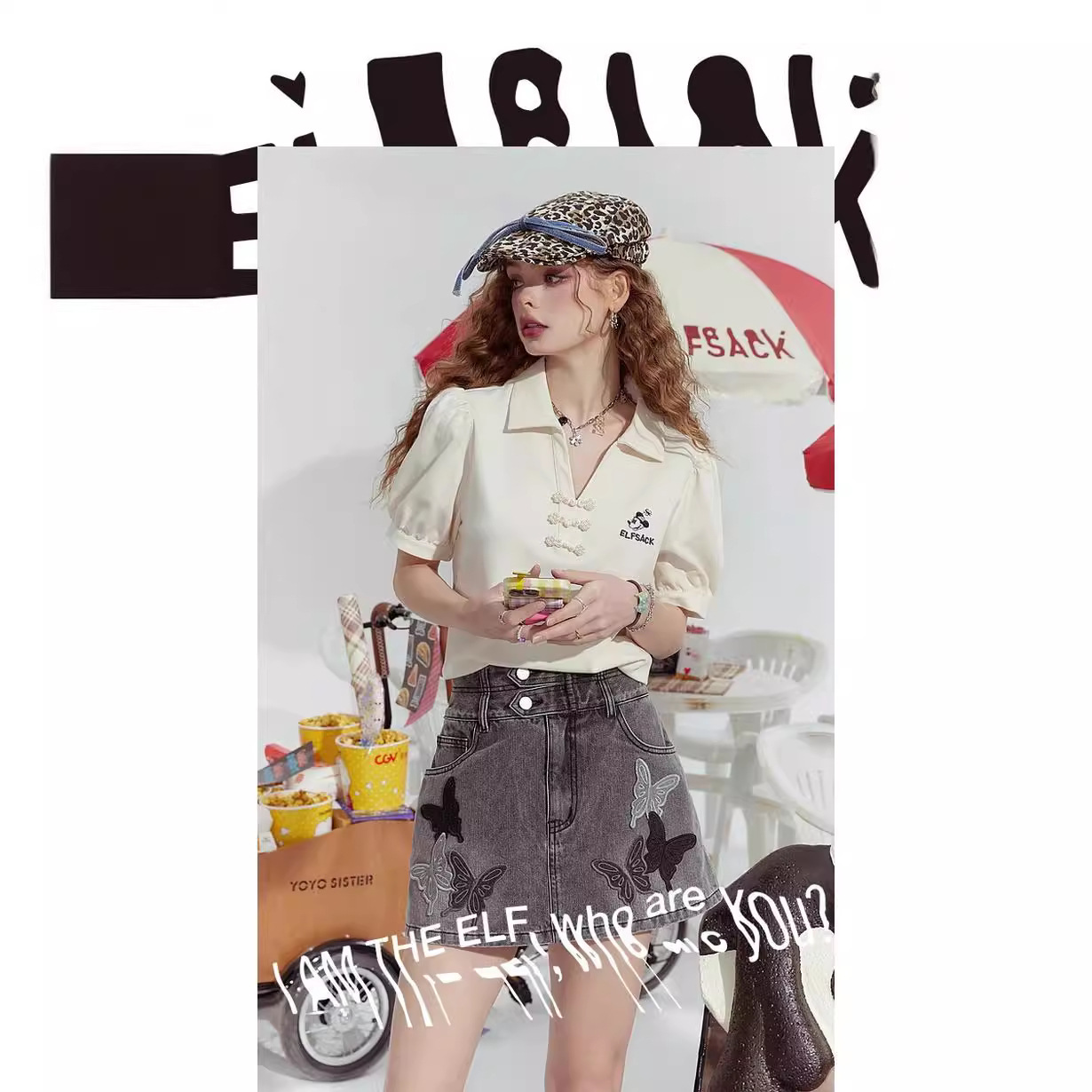 Polo领泡泡袖短袖t恤女夏季新款v领正肩显瘦上衣