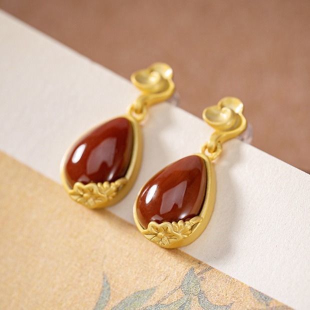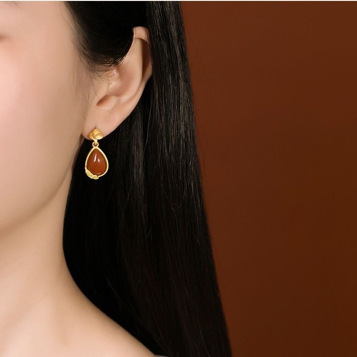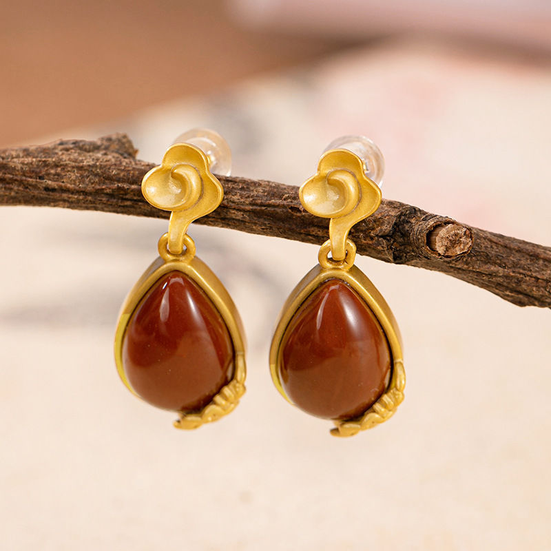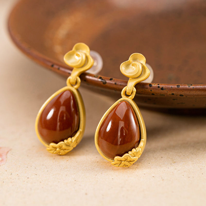 原创S925纯银复古天然南红玛瑙个性荷花仙气森系女士耳钉耳坠耳饰