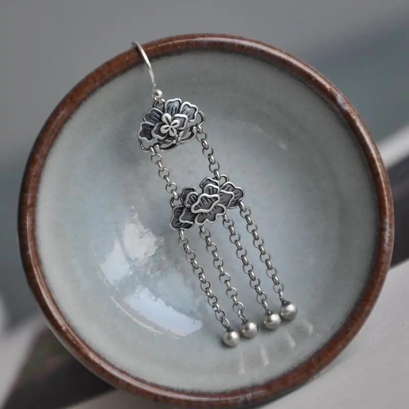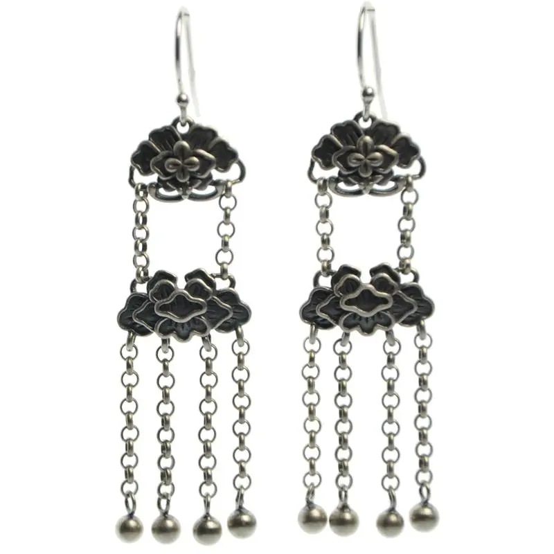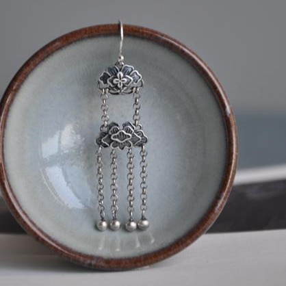 S925银镀金白金色简约文艺百搭民族宫廷风复古气质流苏耳环女