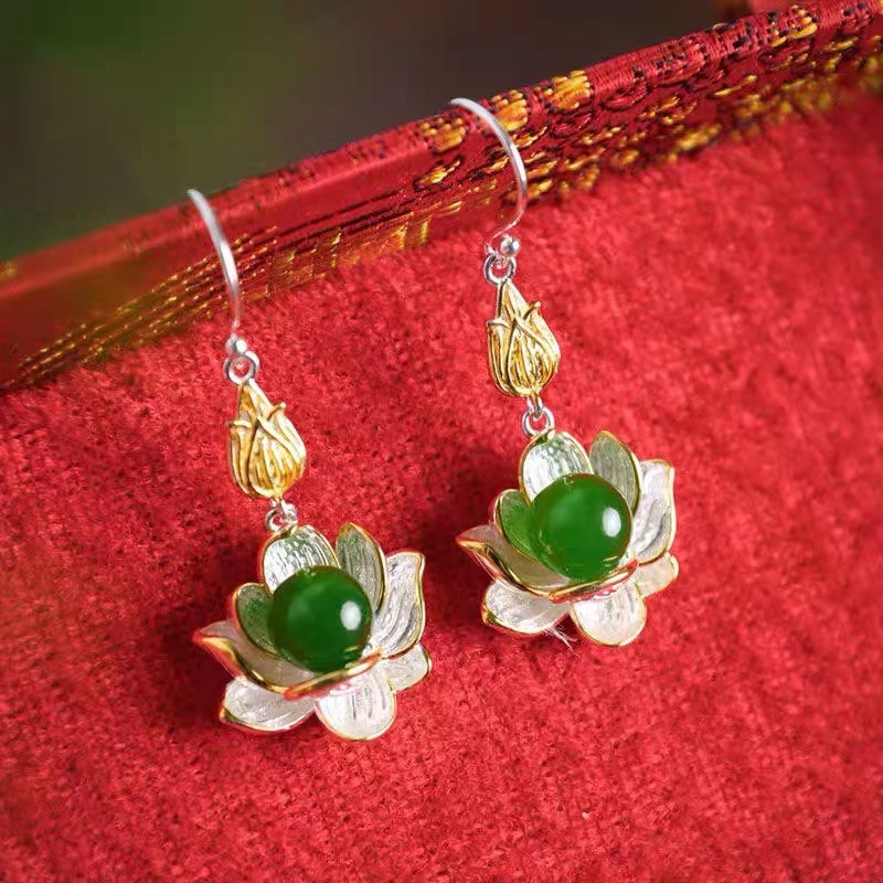和田玉莲花耳环女士S925纯银饰品耳坠民族风个性时尚玉石耳钩饰品