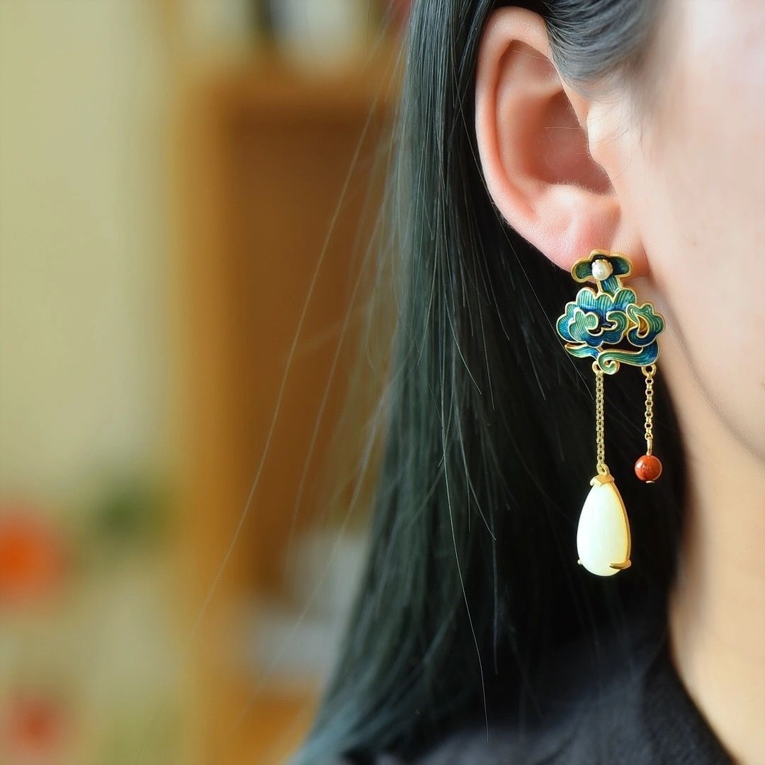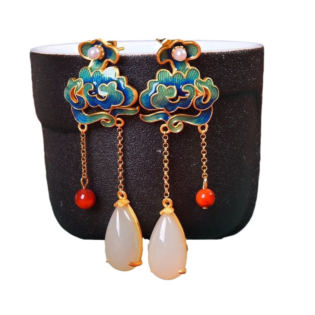 和田烧蓝如意玉兰花复古宫廷镀金色耳钉流苏小花蕙质兰心耳钉