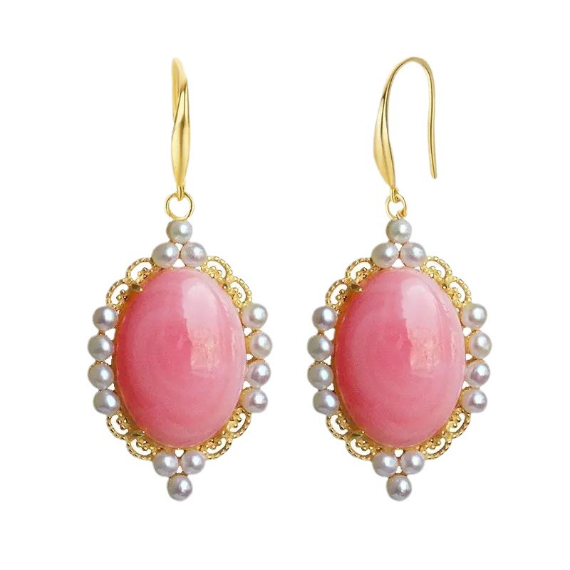 镀纯银时尚精致女王贝耳环耳饰经典气质粉色石圆珠耳坠耳勾女士