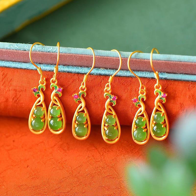 福豆超盈润阳绿碧玉耳环S925纯银鎏金珐琅彩小花耳坠女复古民族风