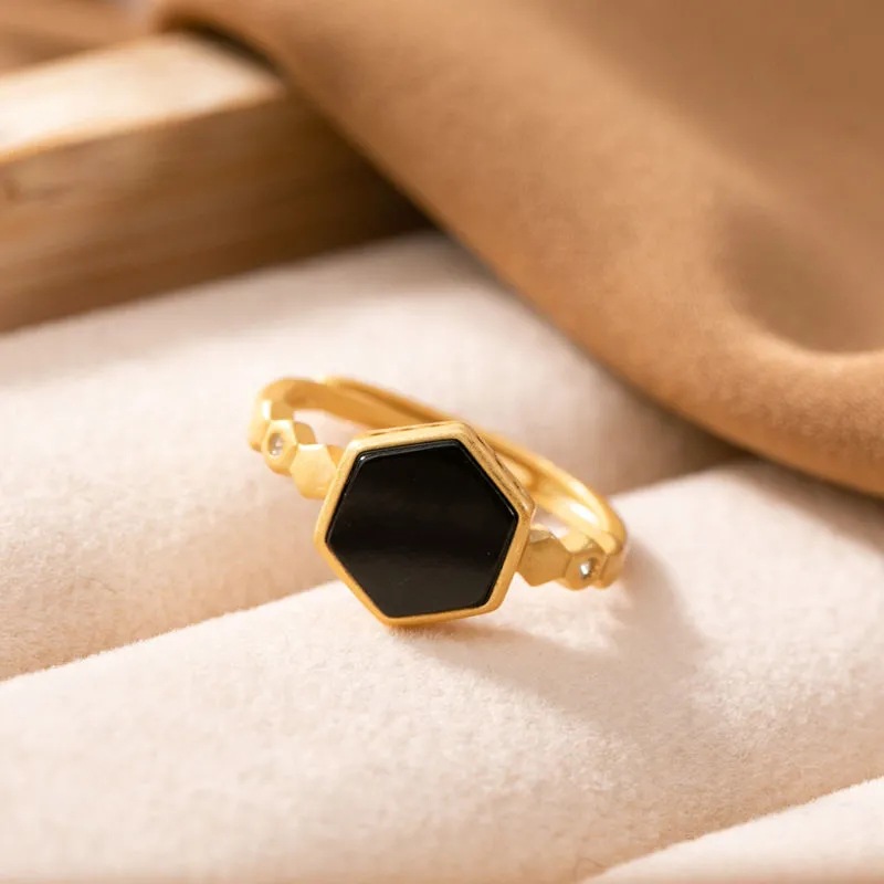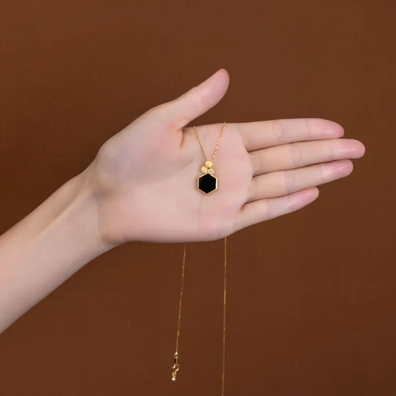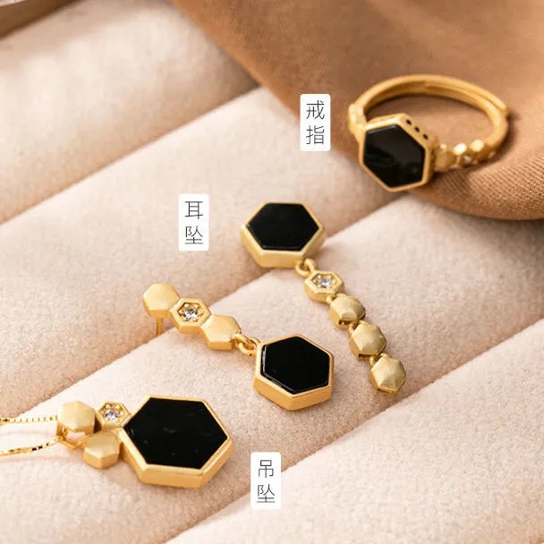 S925纯银纯银镀金天然墨玉个性气质几何形耳钉戒指吊坠