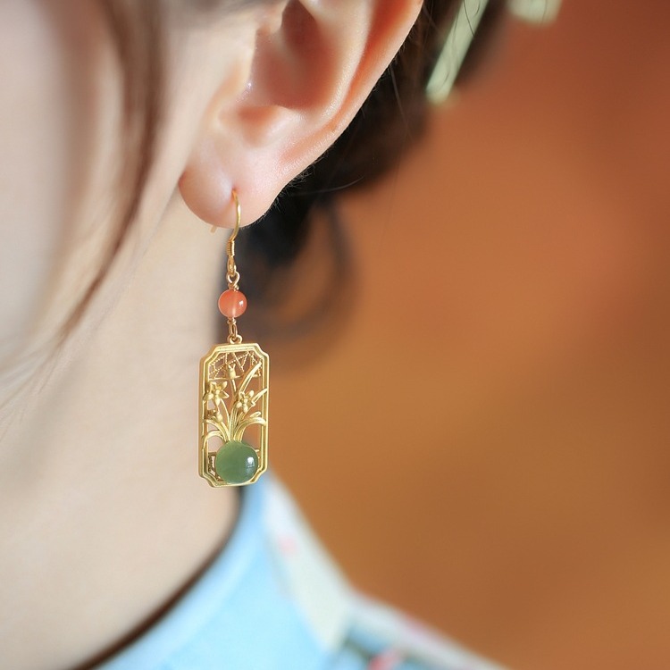 小众高级设计感纯银古法金镶和田玉国潮复古耳环女耳坠耳饰