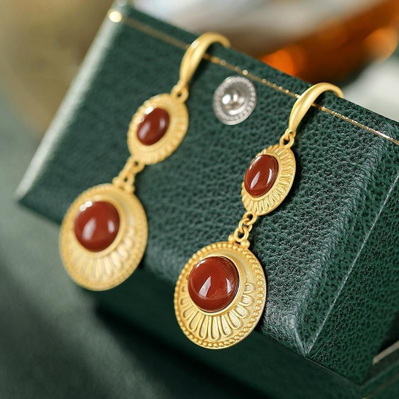 S925纯银镀金南红玛瑙耳环女士气质长款欧美大气高级感耳坠新品款