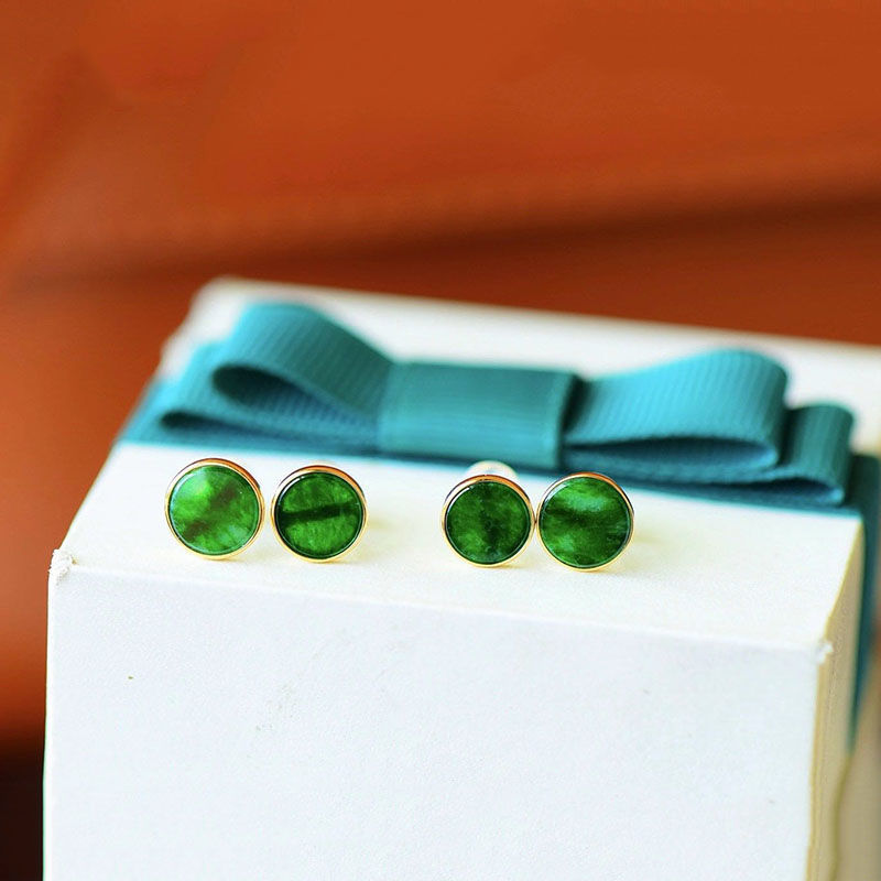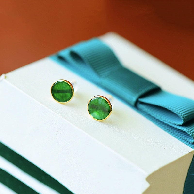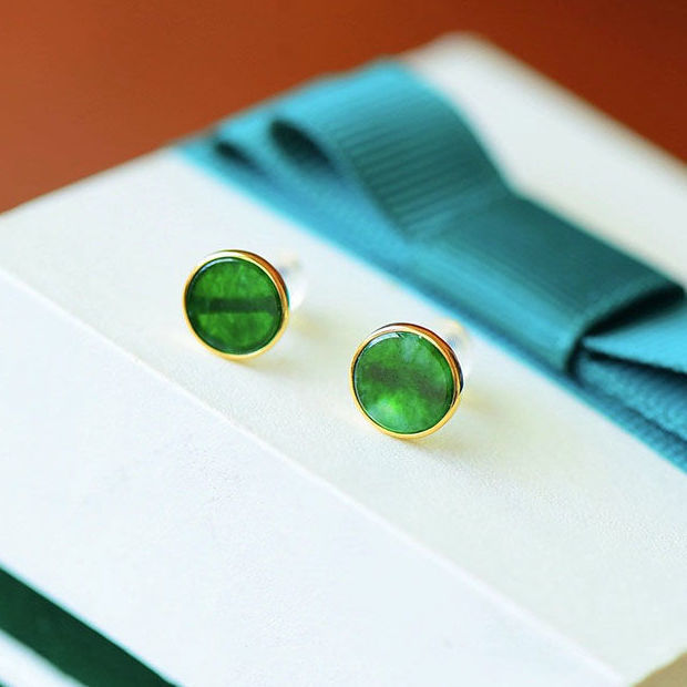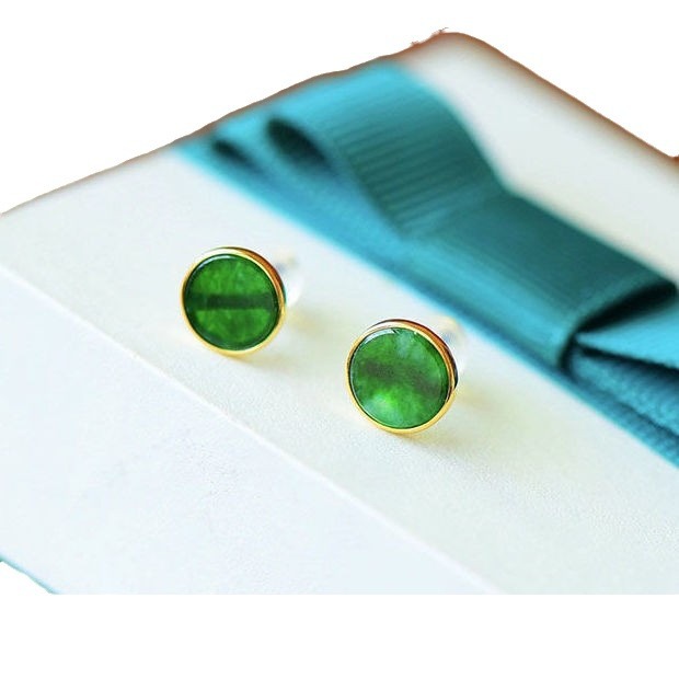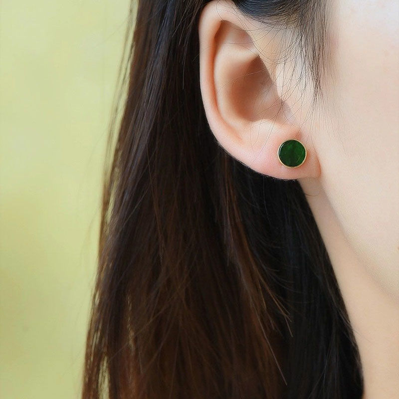 S925纯银圆牌团圆翠绿耳钉镶嵌天然和田玉碧玉简约中国风复古饰品